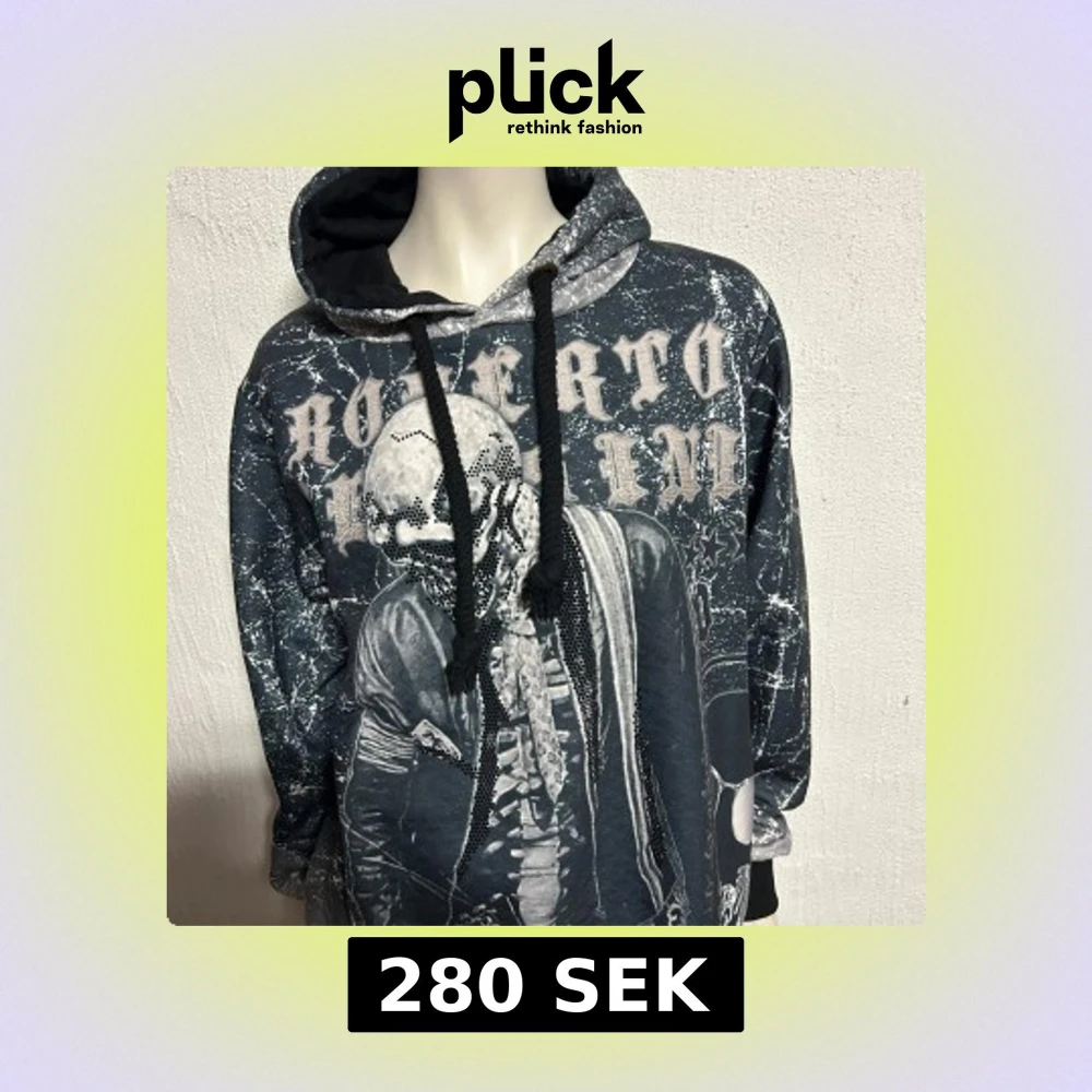 Cool svart hoodie från Roberto Cavalli med ett unikt tryck av en dödskalle och text på framsidan. Hoodien har en justerbar huva med snören och ett mönster som ger en sliten look. Perfekt för en edgy stil!