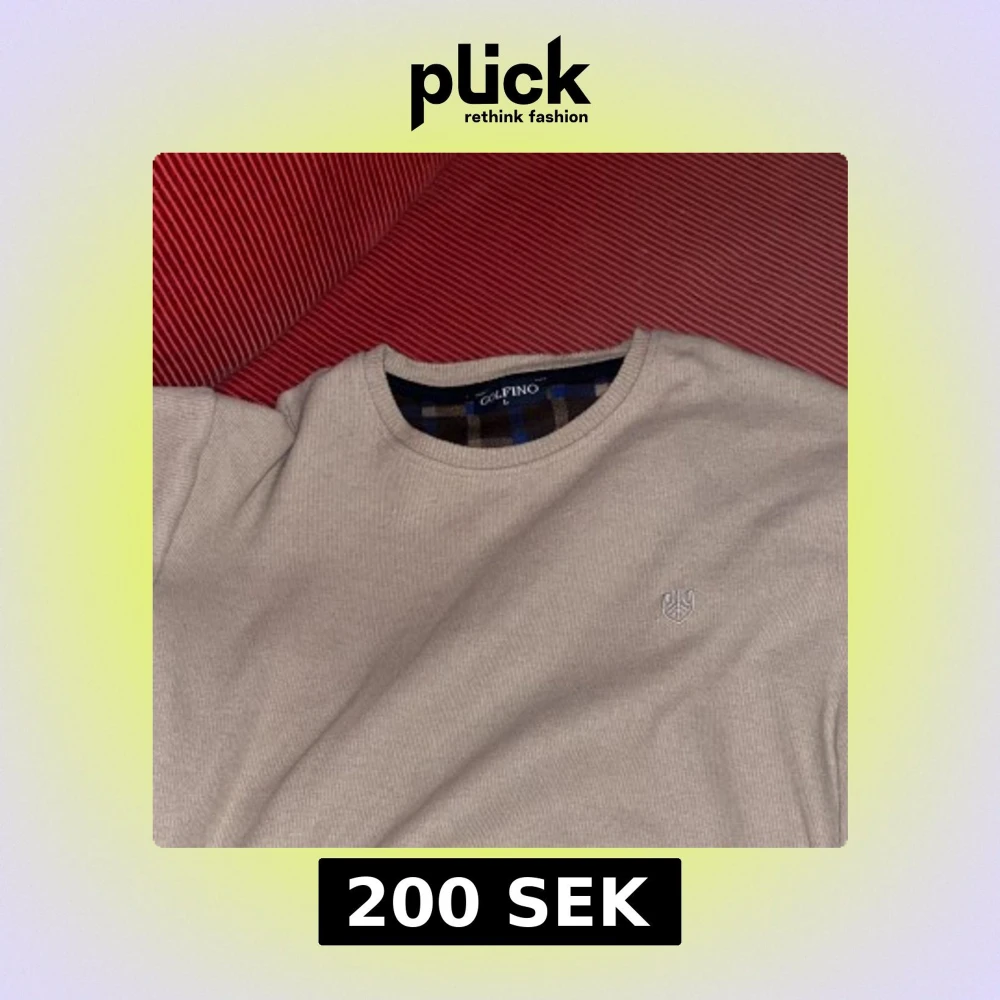 Beige stickad tröja från Golfino med rund hals och diskret logga broderad på bröstet. Insidan av halsen har ett rutigt tyg i blått och brunt som ger en snygg detalj. Perfekt för dig som gillar klassisk och clean stil.