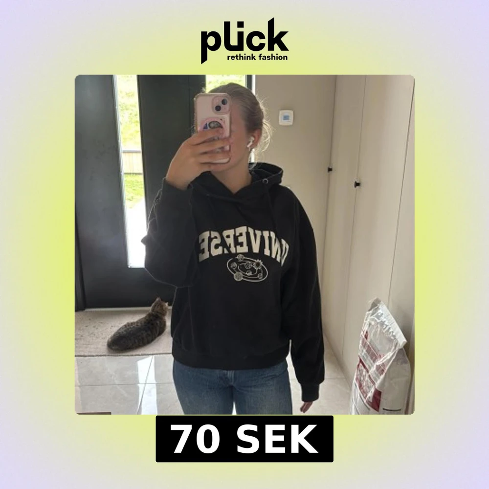 Säljer en svart hoodie från Lager 157 med stor vit logga och tryck framtill.