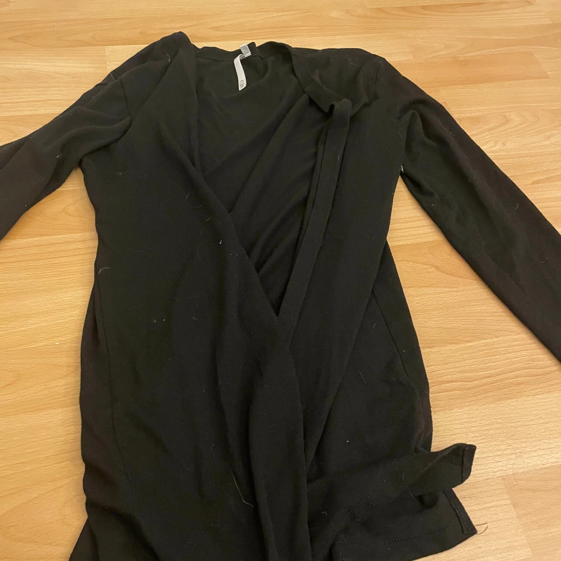 Säljer en svart kofta som går ungefär ner för rumpan.