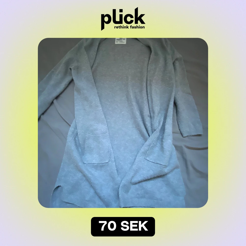 Lång stickad grå kofta med två fickor för barn runt 10års åldern