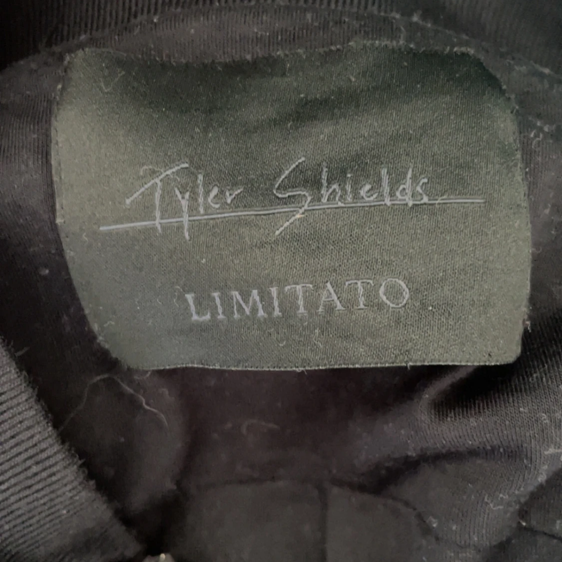 Svart kofta från Limitato i 100% bomull med coolt print på ryggen. Koftan har silverfärgade dragkedjor framtill och på fickorna, samt en klassisk bomberkrage. Passformen är normal och jackan är helsvart med en unik detalj på ryggen. Koftan är väldigt sällsynt och är ett samarbete mellan Tyler Shields x Limitato. Kan gå ner i pris vid snabb affär.
