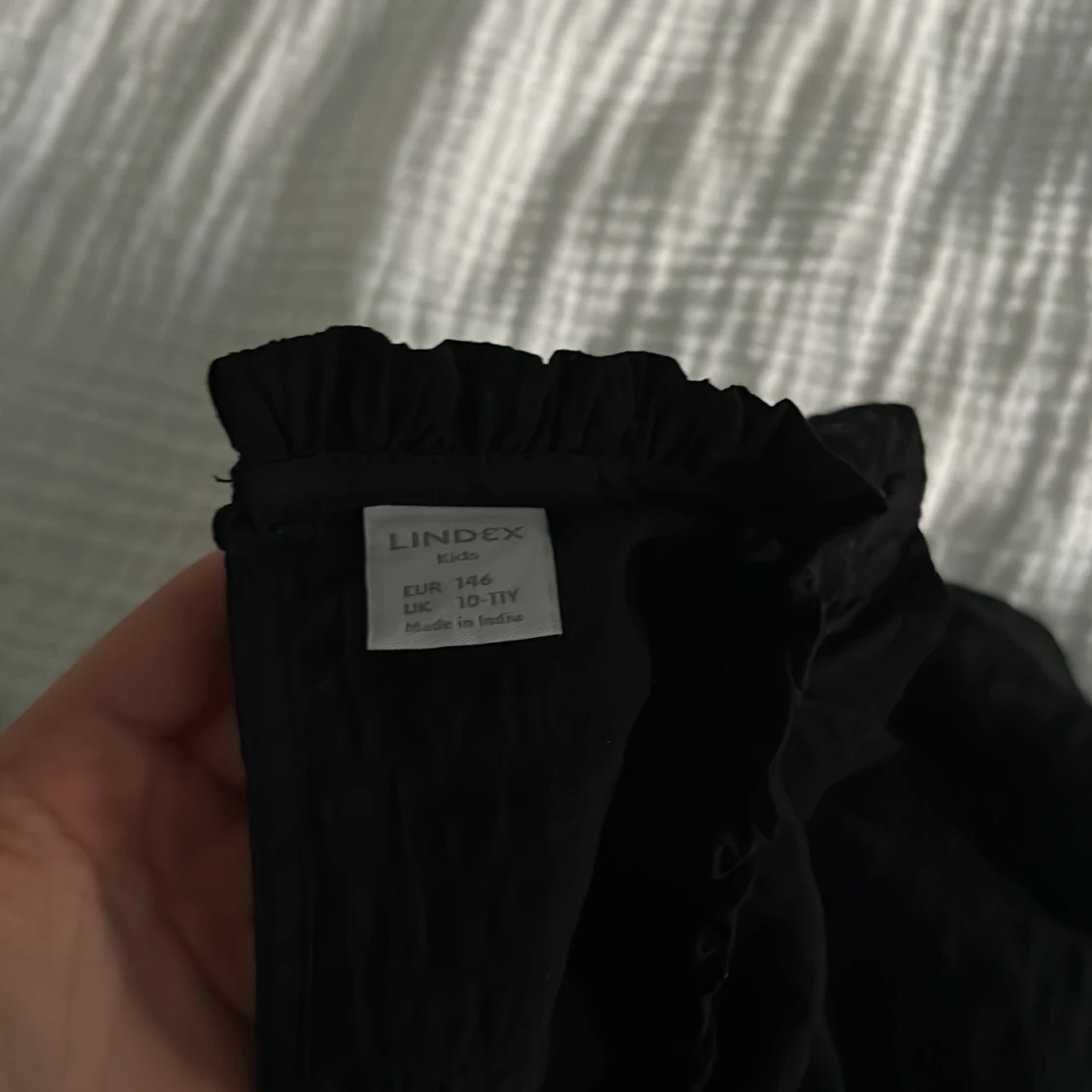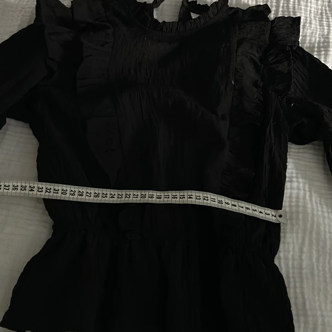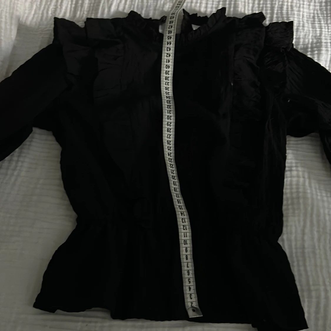 Svart blus från Lindex med långa ärmar och snygga volangdetaljer längs axlar och halsringning. Blusen har en lätt rynkad struktur och är tillverkad i ett tunt, luftigt material. Perfekt för dig som gillar en stilren men ändå trendig look.