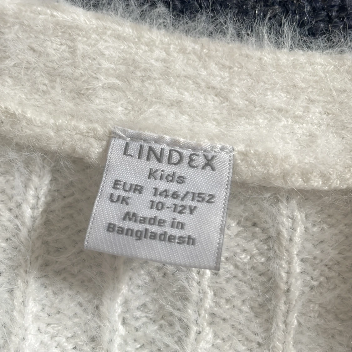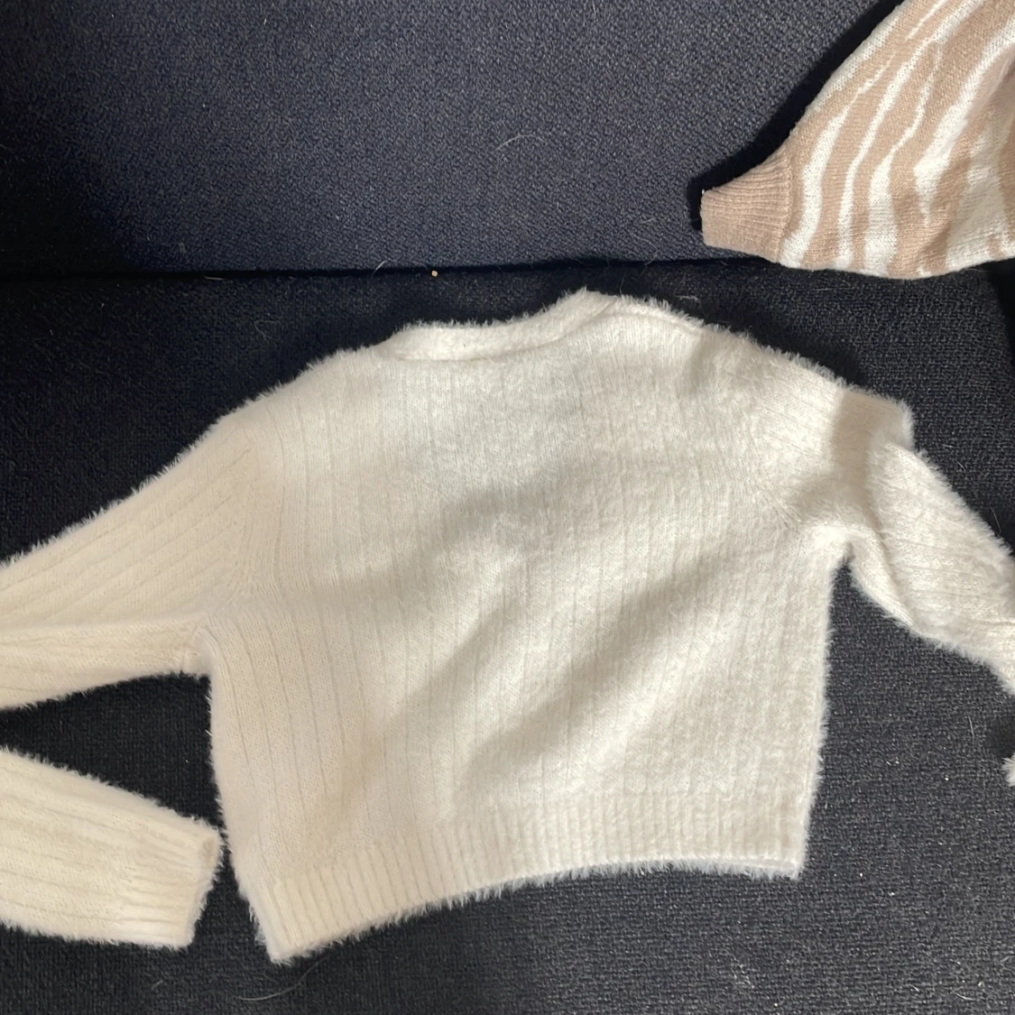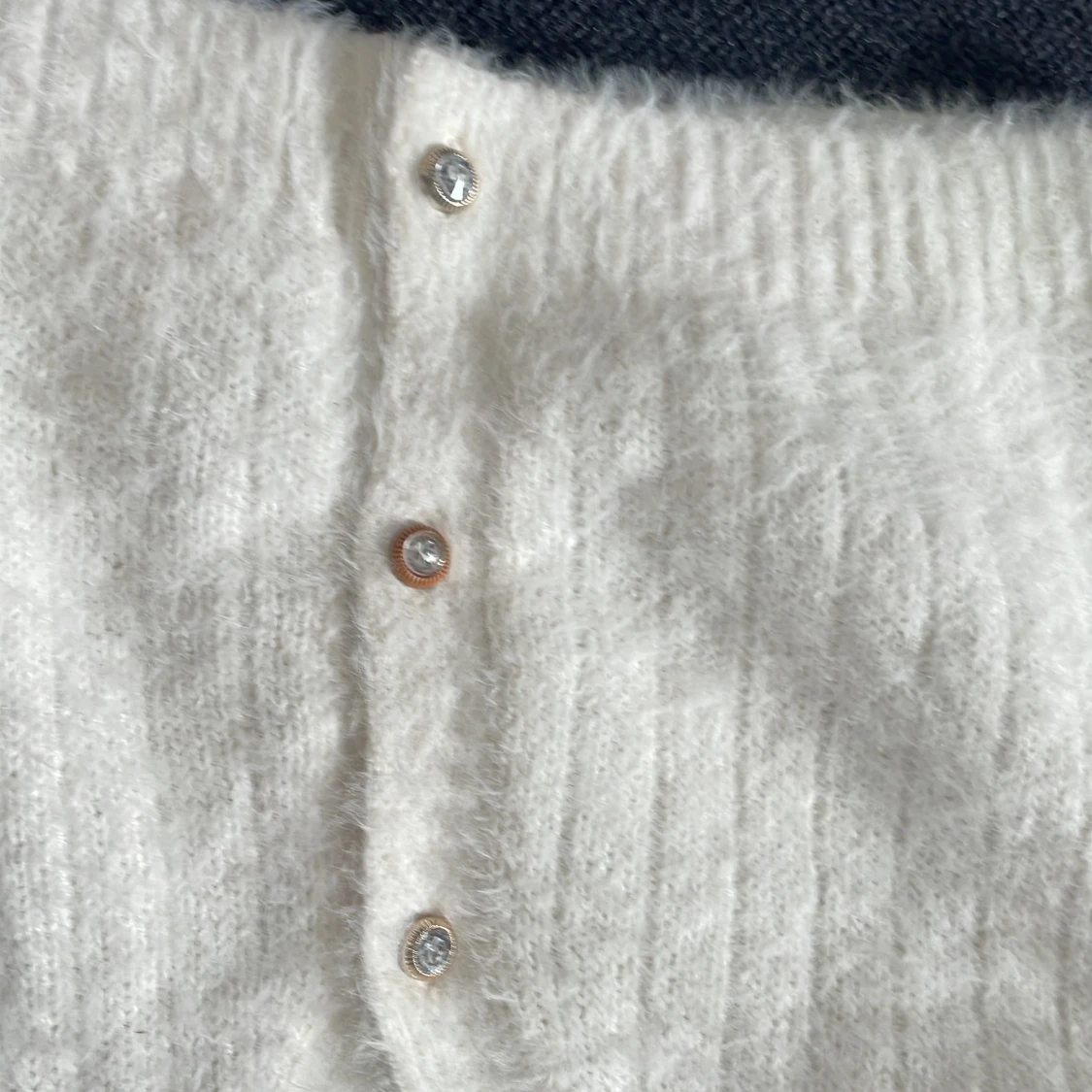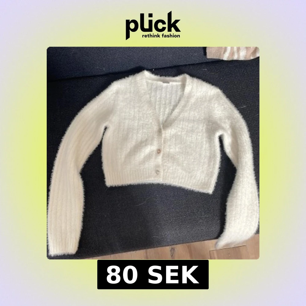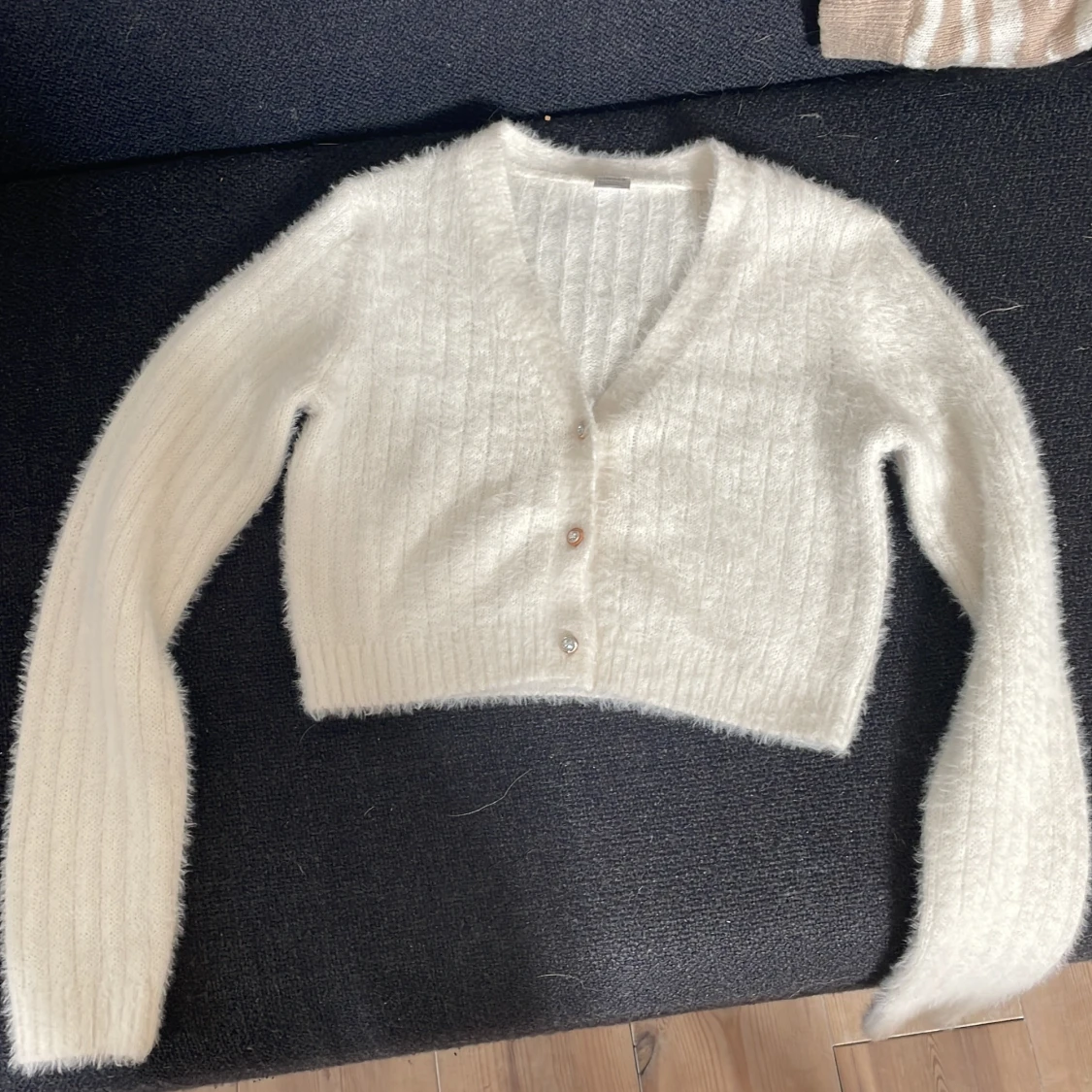 Supermjuk och fluffig vit kofta från Lindex med croppad passform. Koftan har ribbade muddar, v-ringning och tre glittriga knappar framtill. Perfekt för lager-på-lager och ger en mysig vibe till din outfit.