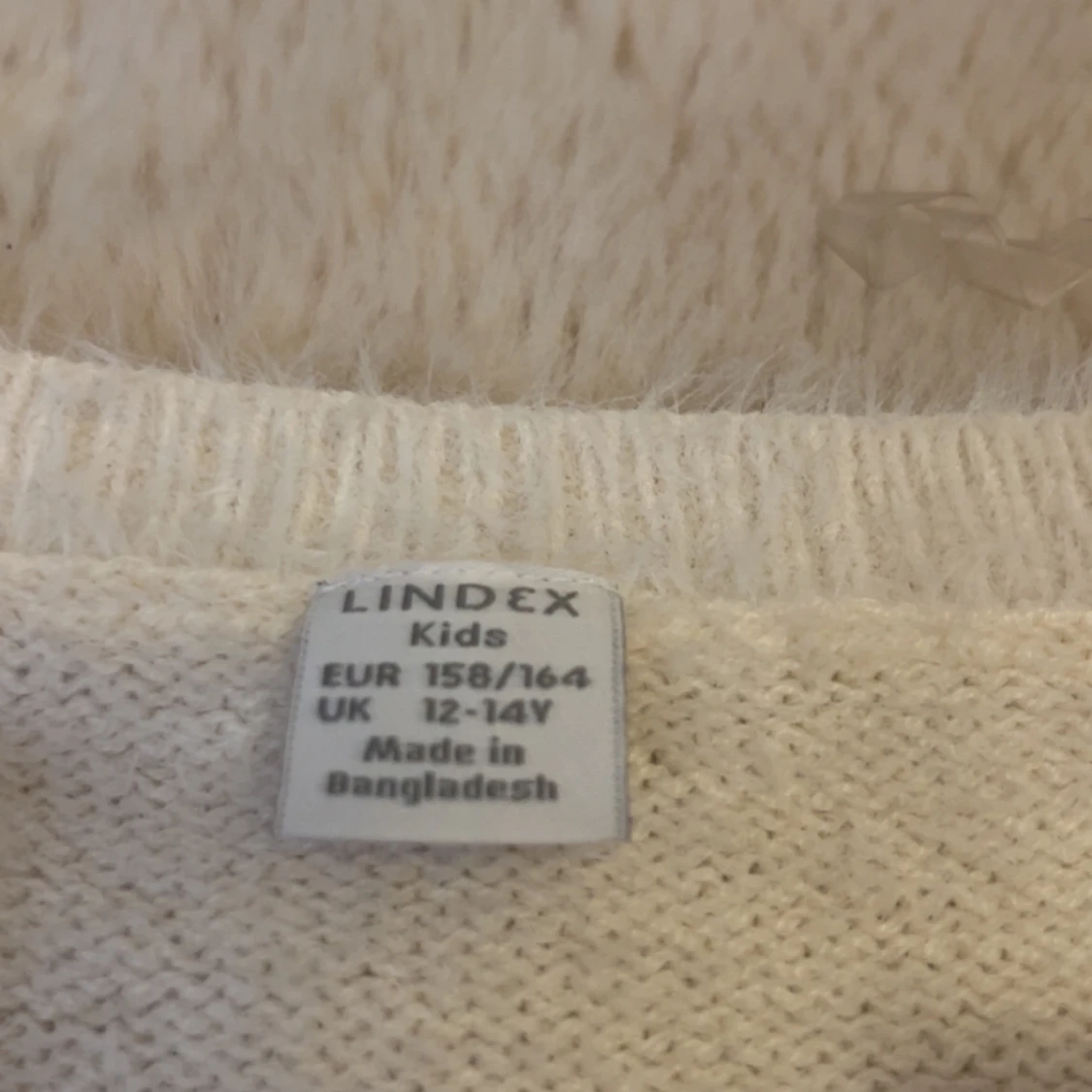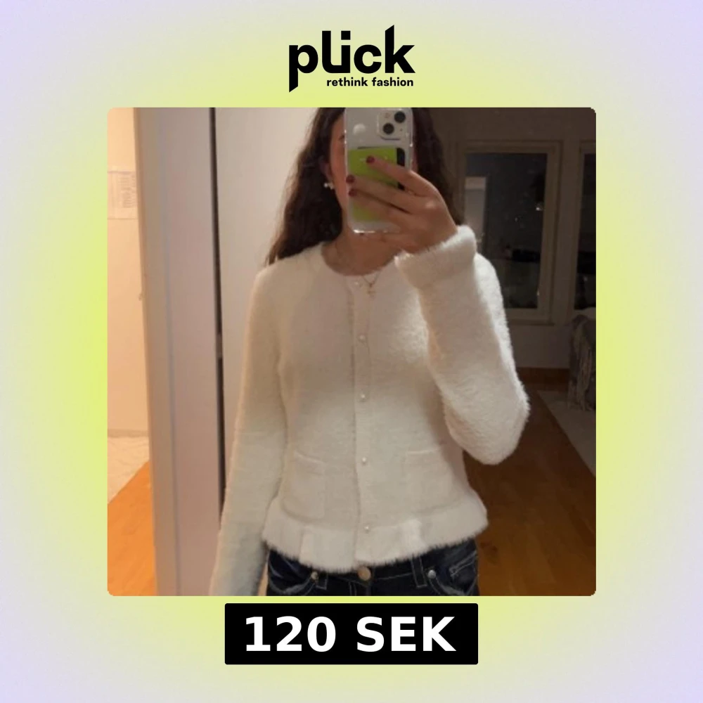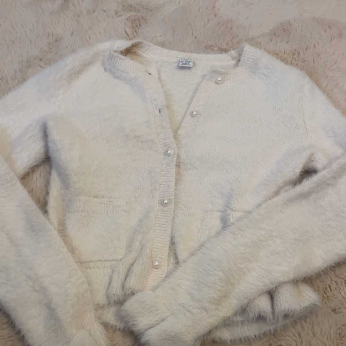 Supermjuk och söt fluffig vit kofta från Lindex med pärlknappar och två små fickor framtill. Den är snygg att ha över en tröja eller försig!💞