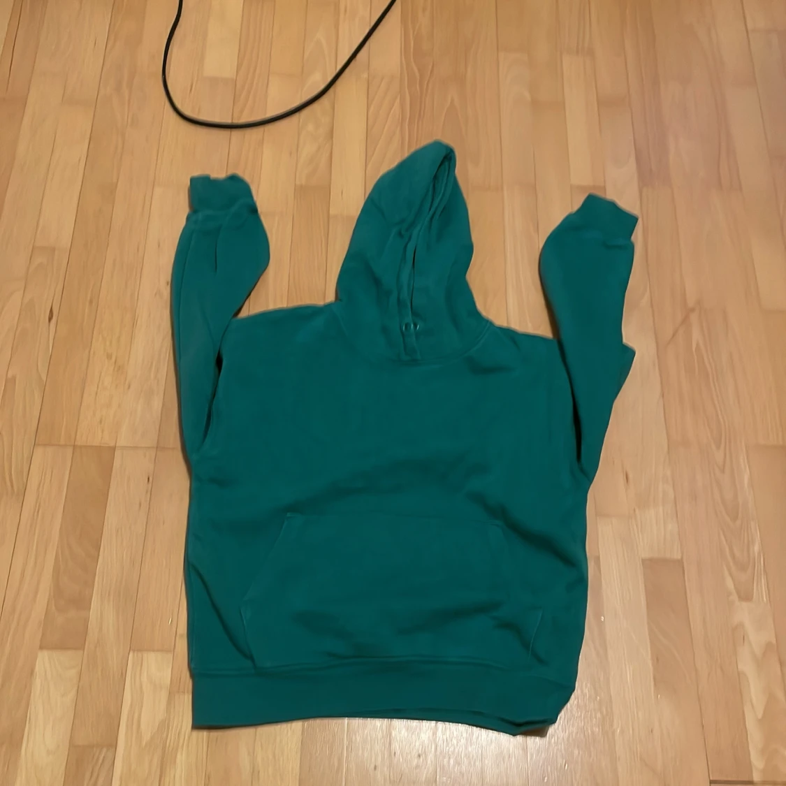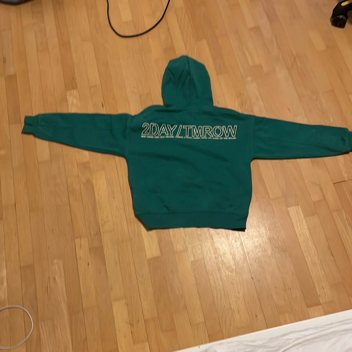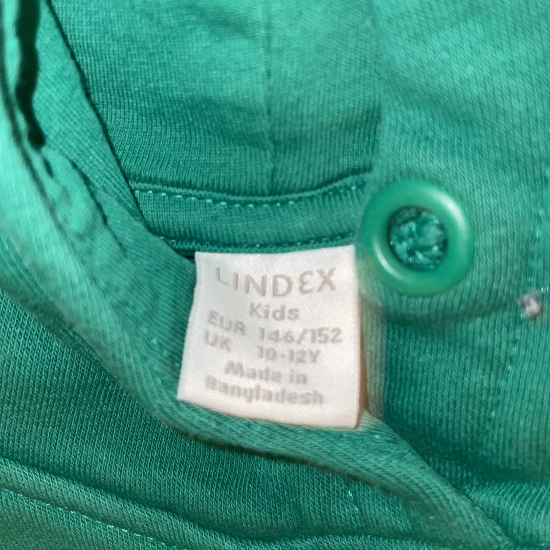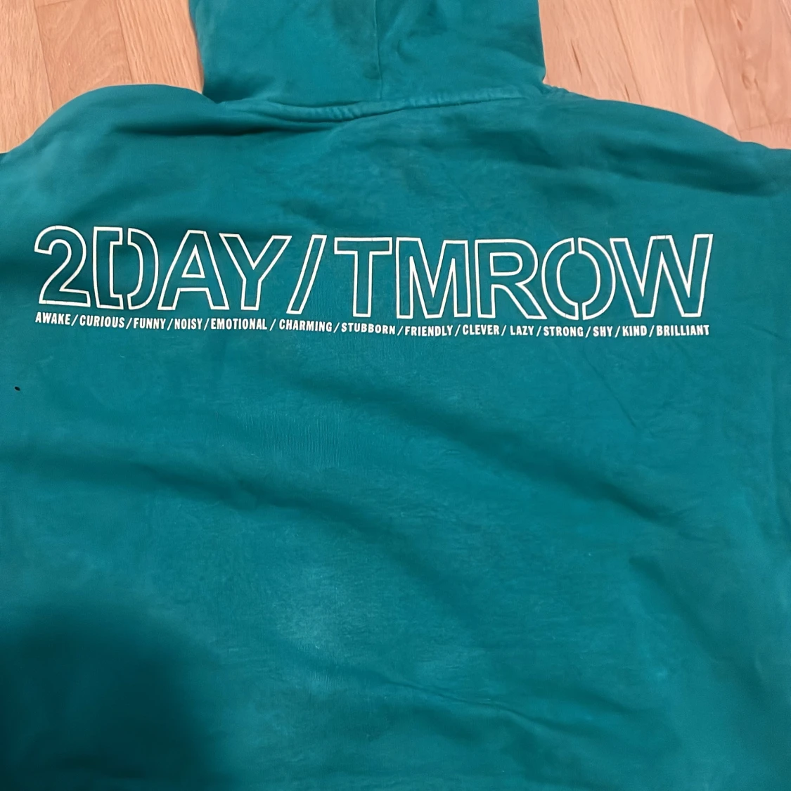 Säljer en grön hoodie från Lindex med texten '2DAY/TMROW' på ryggen. Tröjan har långa ärmar och en klassisk huva. Perfekt för en avslappnad stil.