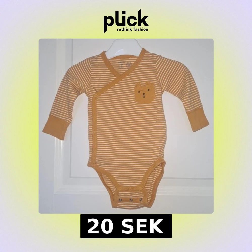Supergullig omlottbody från Lindex i senapsgult och vitt med smala ränder. En söt liten ficka framtill i form av ett björnhuvud. Extra långa ärmar & dubbel knäppning, för extra långbarhet. Perfekt för de minsta att växa i!