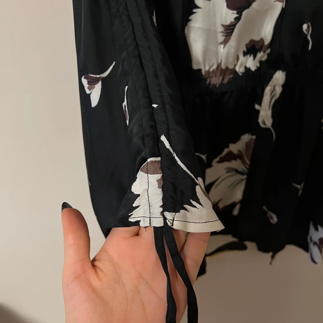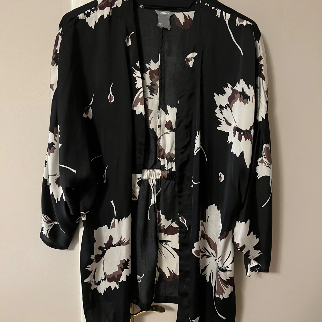 Säljer en superfin svart kimono från Lindex med stora vita och bruna blommor. Den har trekvartsärmar och ett knytband i midjan för en snygg passform. Perfekt för både vardag och fest! 🌸