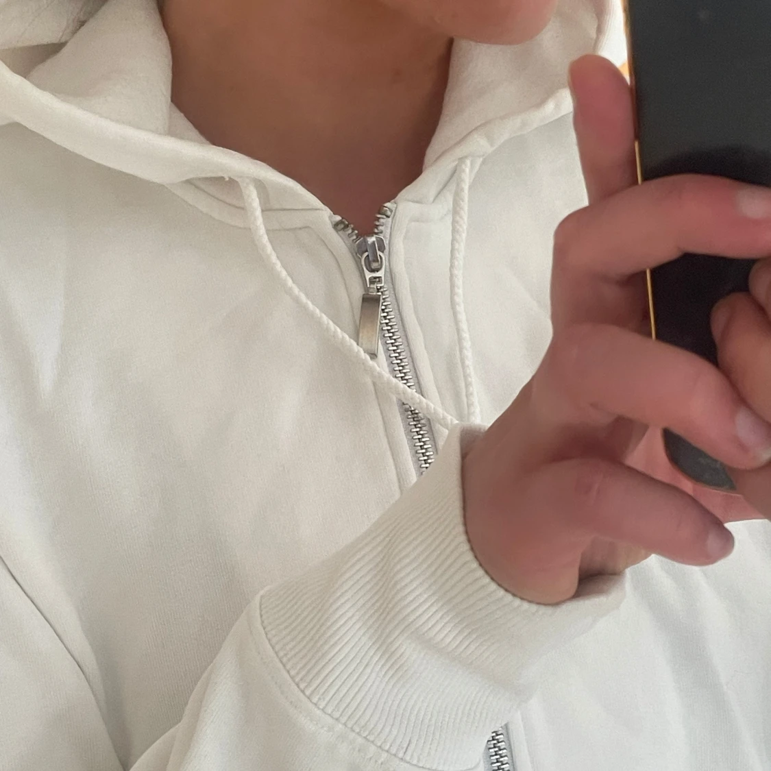 Säljer en stilren vit hoodie med dragkedja framtill och huva med snörning. Tröjan har långa ärmar, ribbade muddar och två fickor framtill. Perfekt för en avslappnad look och enkel att matcha med det mesta.