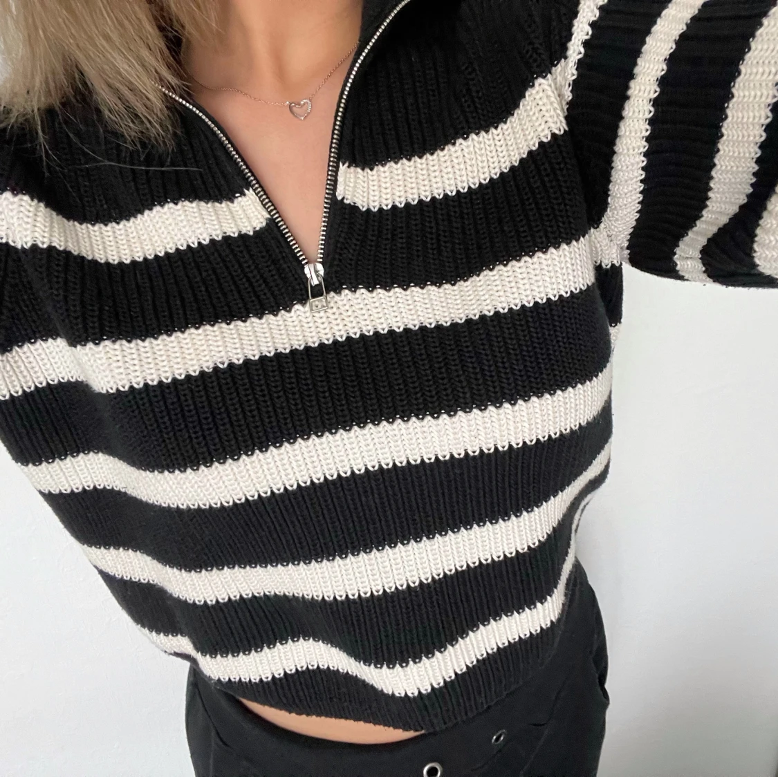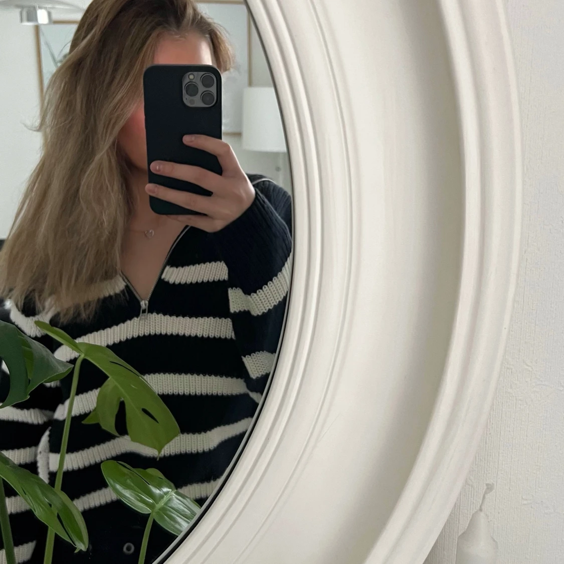Säljer denna snygga randiga tröjan med dragkedja från Lindex. Den har används en gång och har därför inga defekter. Nypris 500kr. Köpare står för frakt!🖤🤍🖤🤍