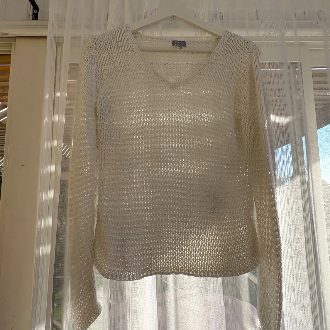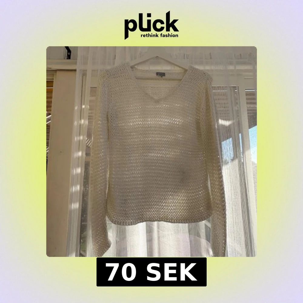 Säljer en vit stickad tröja från Lindex i storlek M. Tröjan har v-ringning och är långärmad med ett luftigt, grovmaskigt stickat material. Perfekt för lager-på-lager och passar snyggt till jeans eller kjol.
