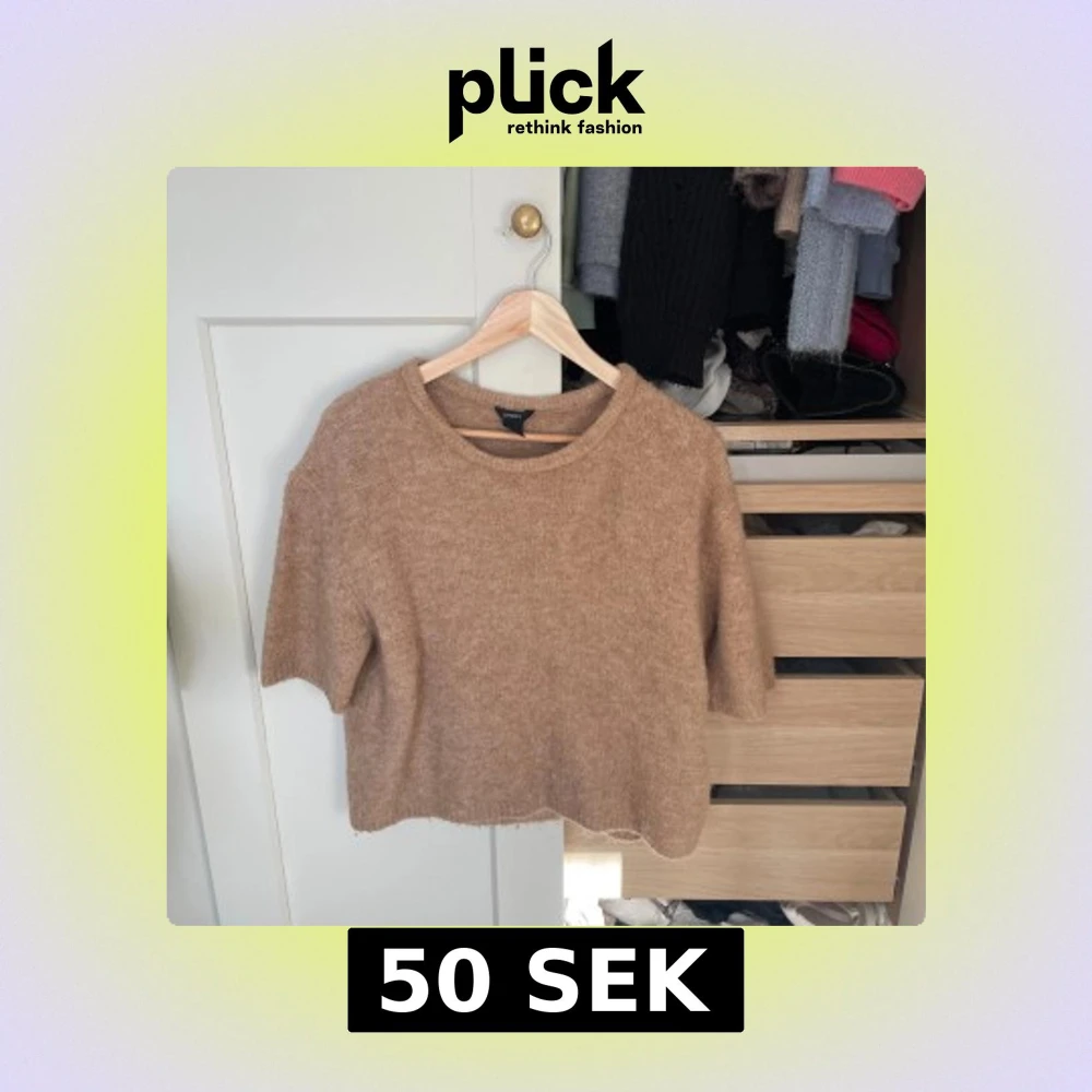 Mysig beige stickad tröja från Lindex med korta ärmar och rund hals. Tröjan har en croppad passform och är perfekt att styla med höga jeans eller kjol. Enkel och stilren design som passar till många outfits.