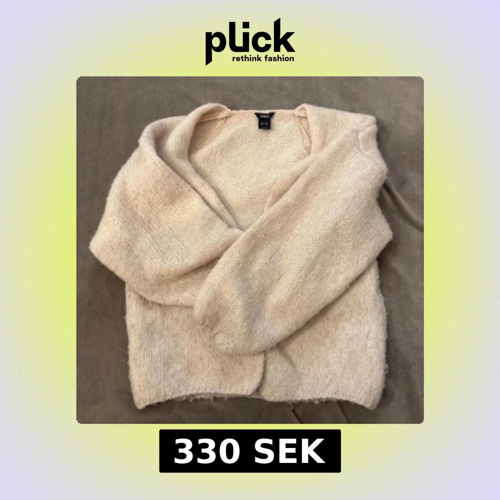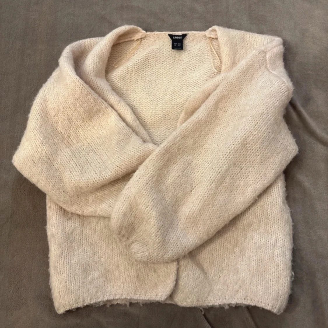 Mysig beige stickad kofta från Lindex i storlek S. Koftan har en mjuk och fluffig känsla, långärmad design och en öppen front utan knappar. Perfekt att slänga på sig när det är lite kyligt ute. Passar dig som gillar en enkel och chill stil.