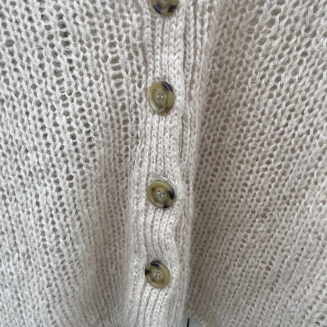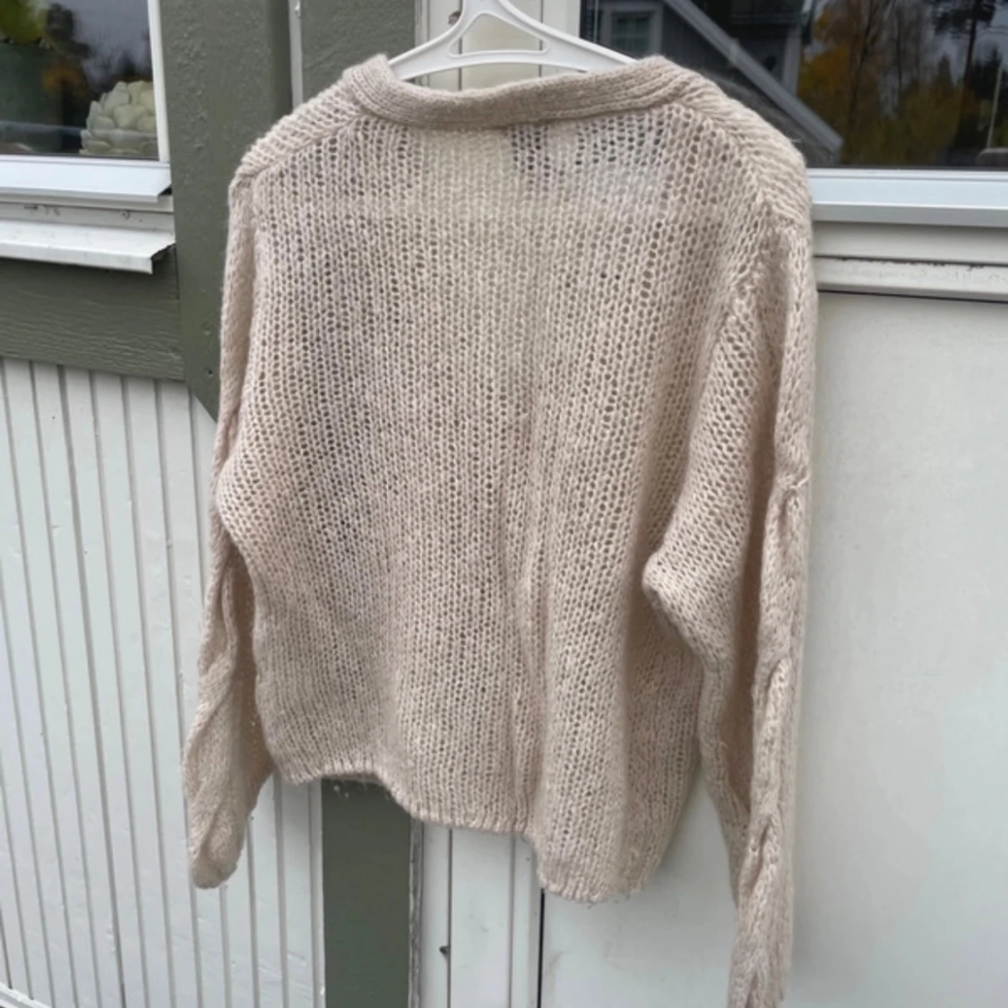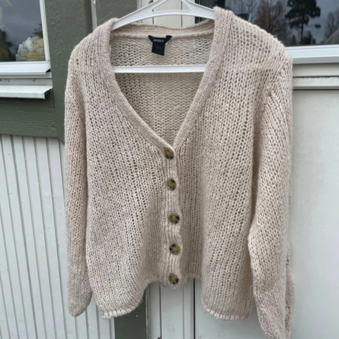 Mysig beige stickad kofta från Lindex i storlek S. Koftan har grovstickat material, snygga flätade detaljer på ärmarna och fem stora knappar framtill. V-ringad hals och långärmad modell som ger en chill och avslappnad vibe.