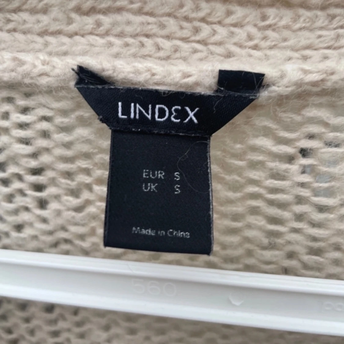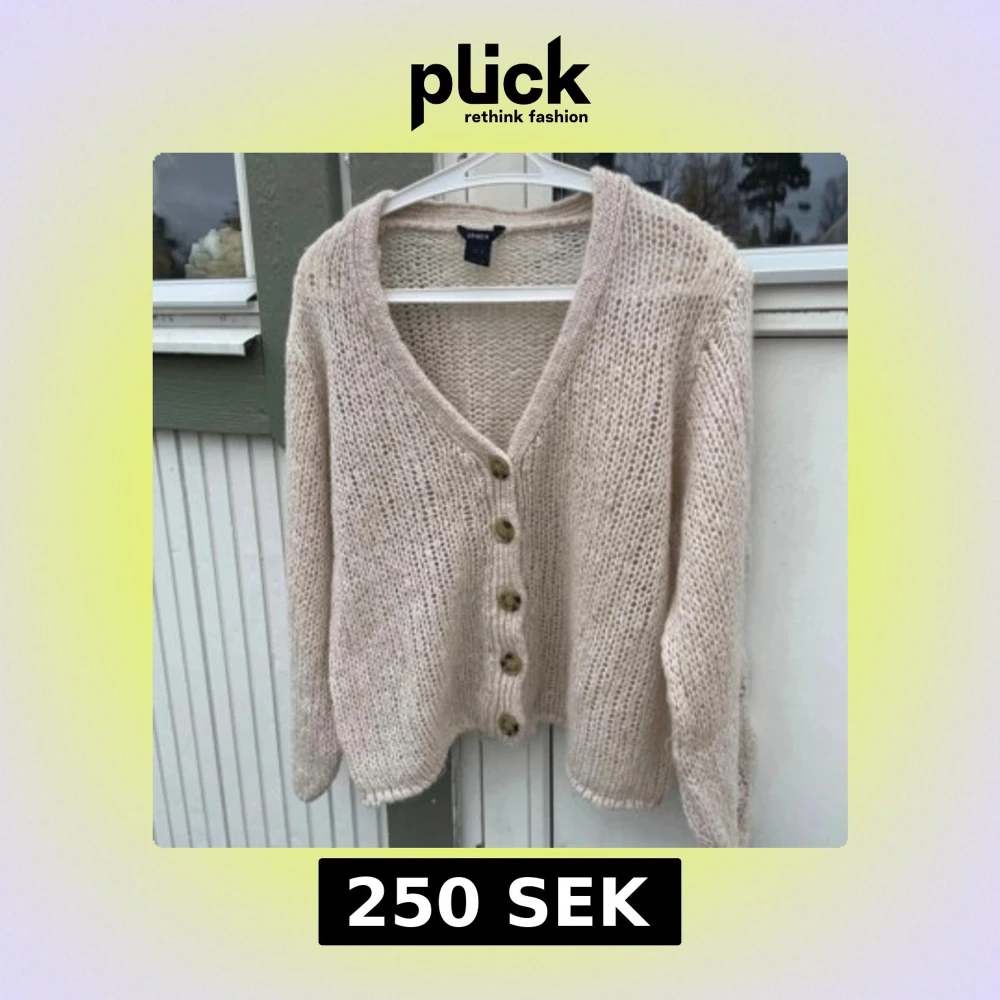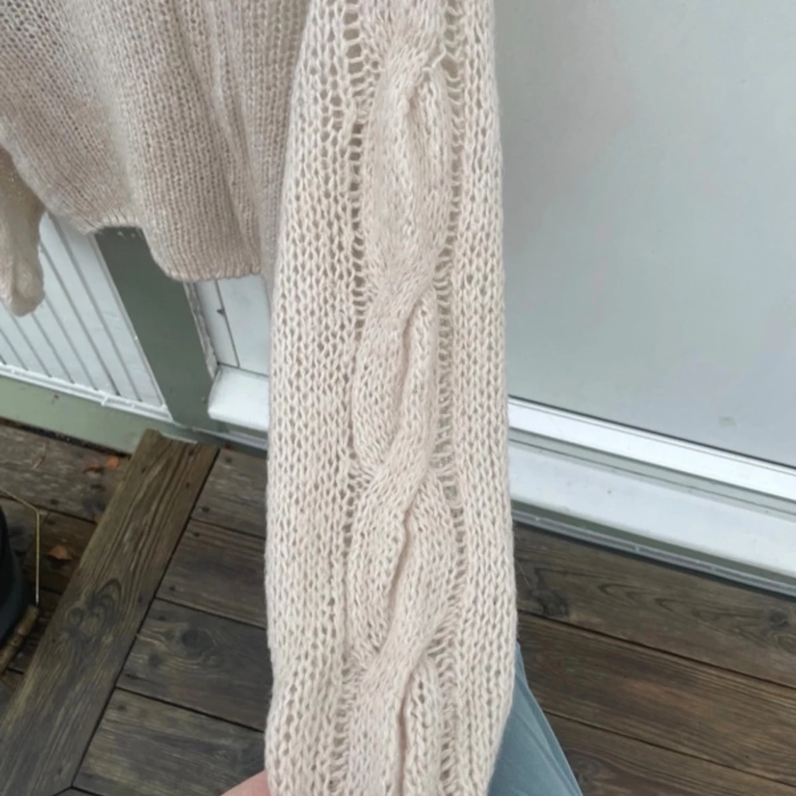 Mysig beige stickad kofta från Lindex i storlek S. Koftan har grovstickat material, snygga flätade detaljer på ärmarna och fem stora knappar framtill. V-ringad hals och långärmad modell som ger en chill och avslappnad vibe.