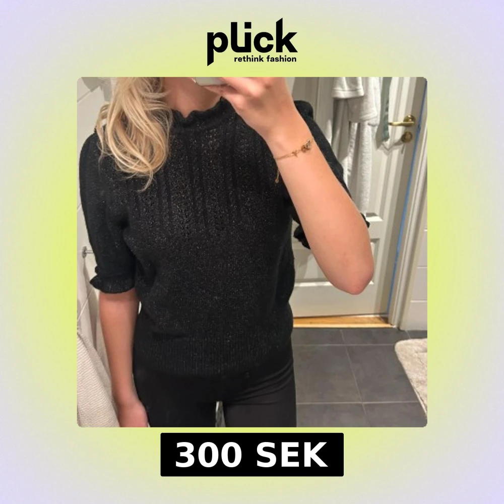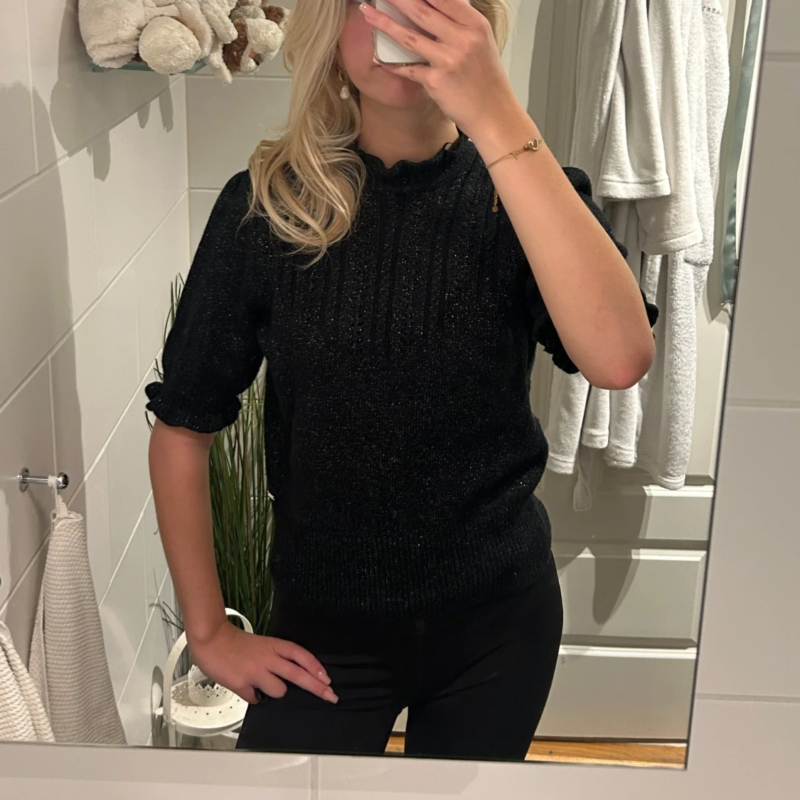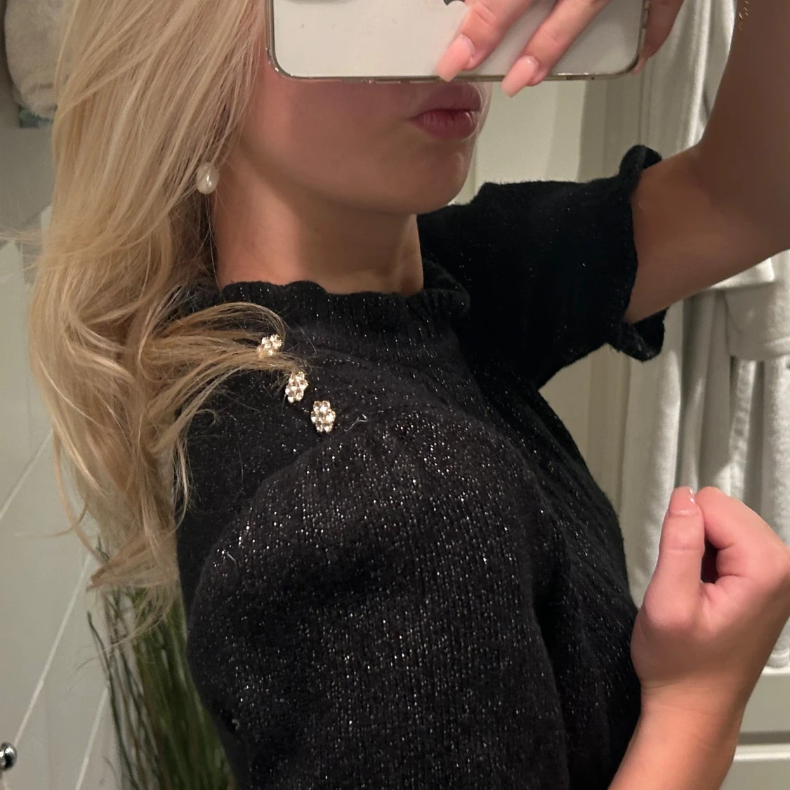 Supersnygg svart stickad tröja med glittriga inslag och korta puffärmar. Tröjan har en liten volang vid halsen och pärlformade knappar på ena axeln som extra detalj.