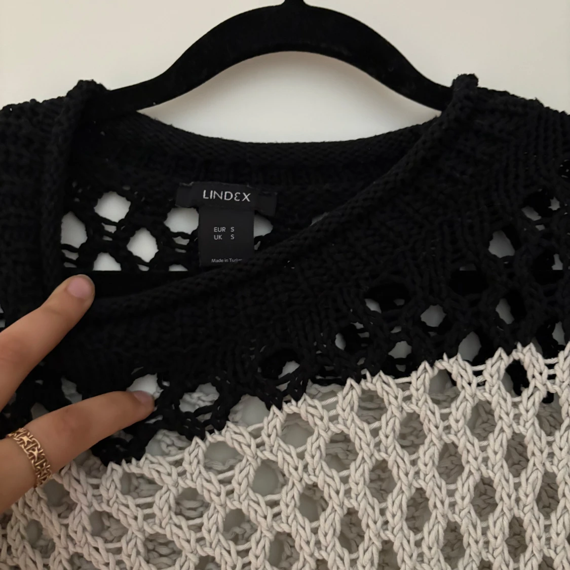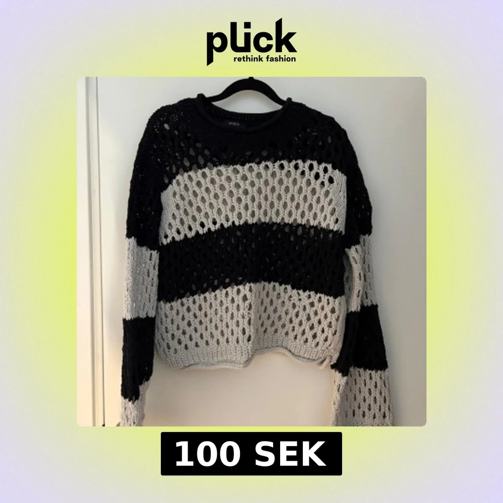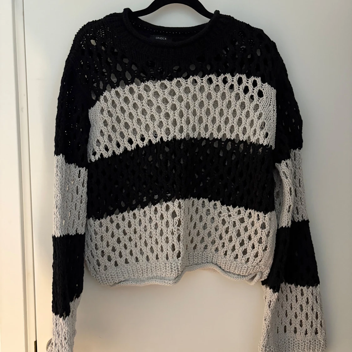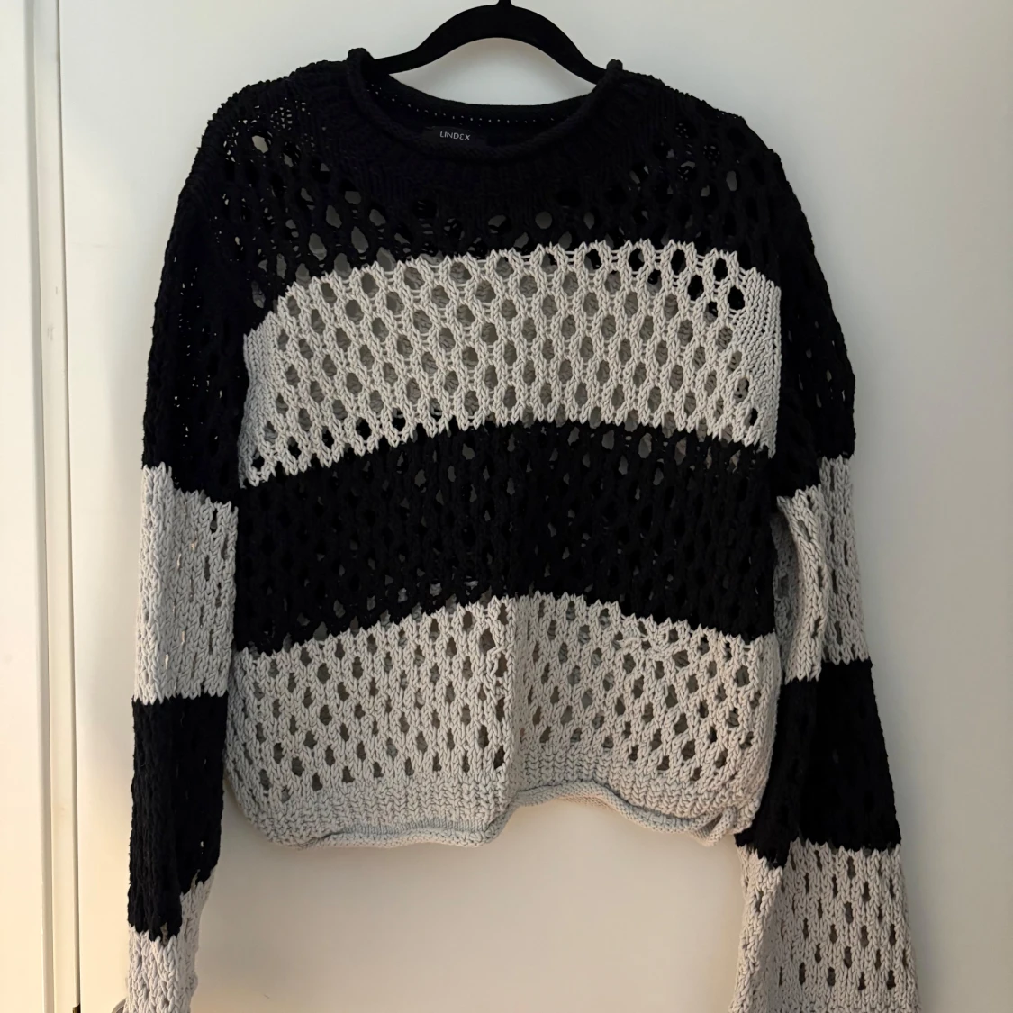 Säljer en stickad tröja från Lindex i storlek S. Tröjan har breda svarta och, är grovstickad med hålmönster och har lång ärm. Perfekt för lager-på-lager och ger en cool, avslappnad vibe.