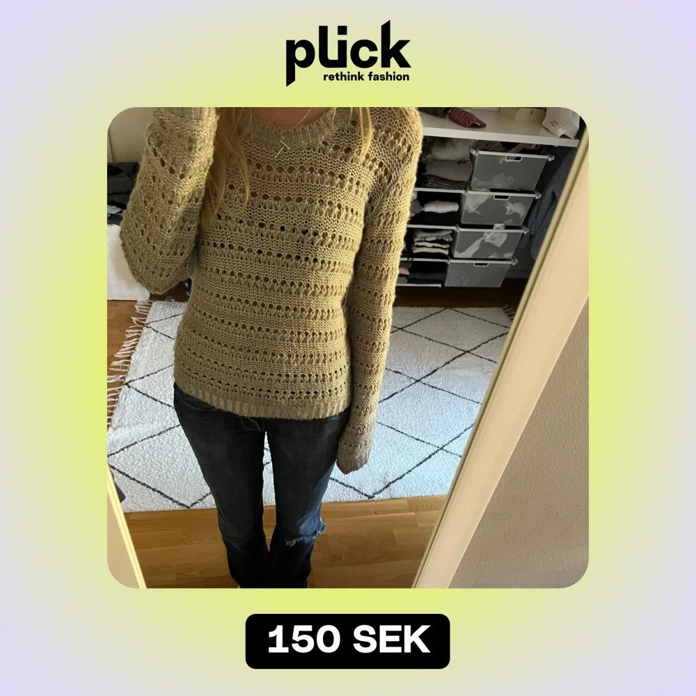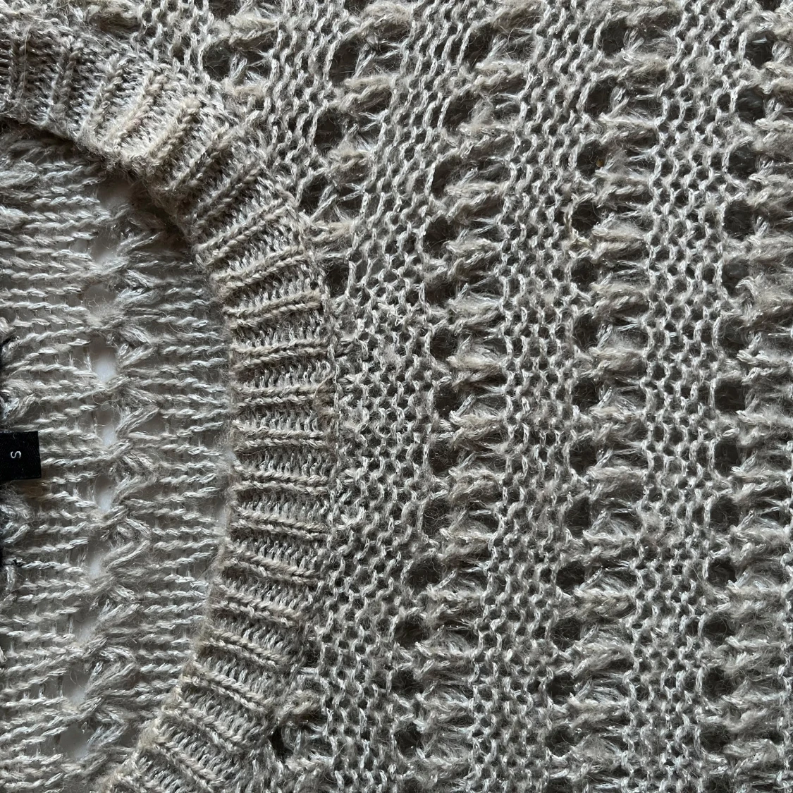 Säljer en superfin beige stickad tröja i storlek S. Den har ett snyggt hålmönster