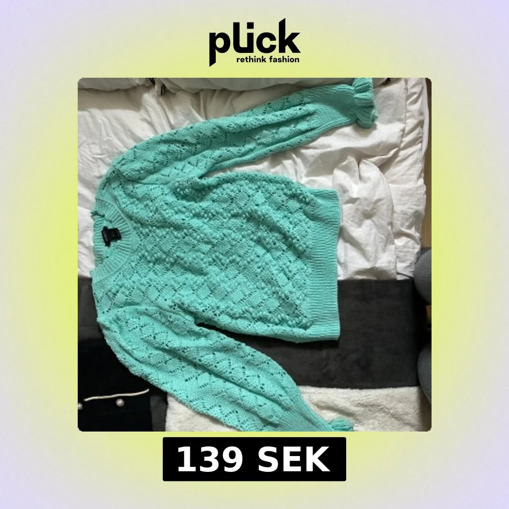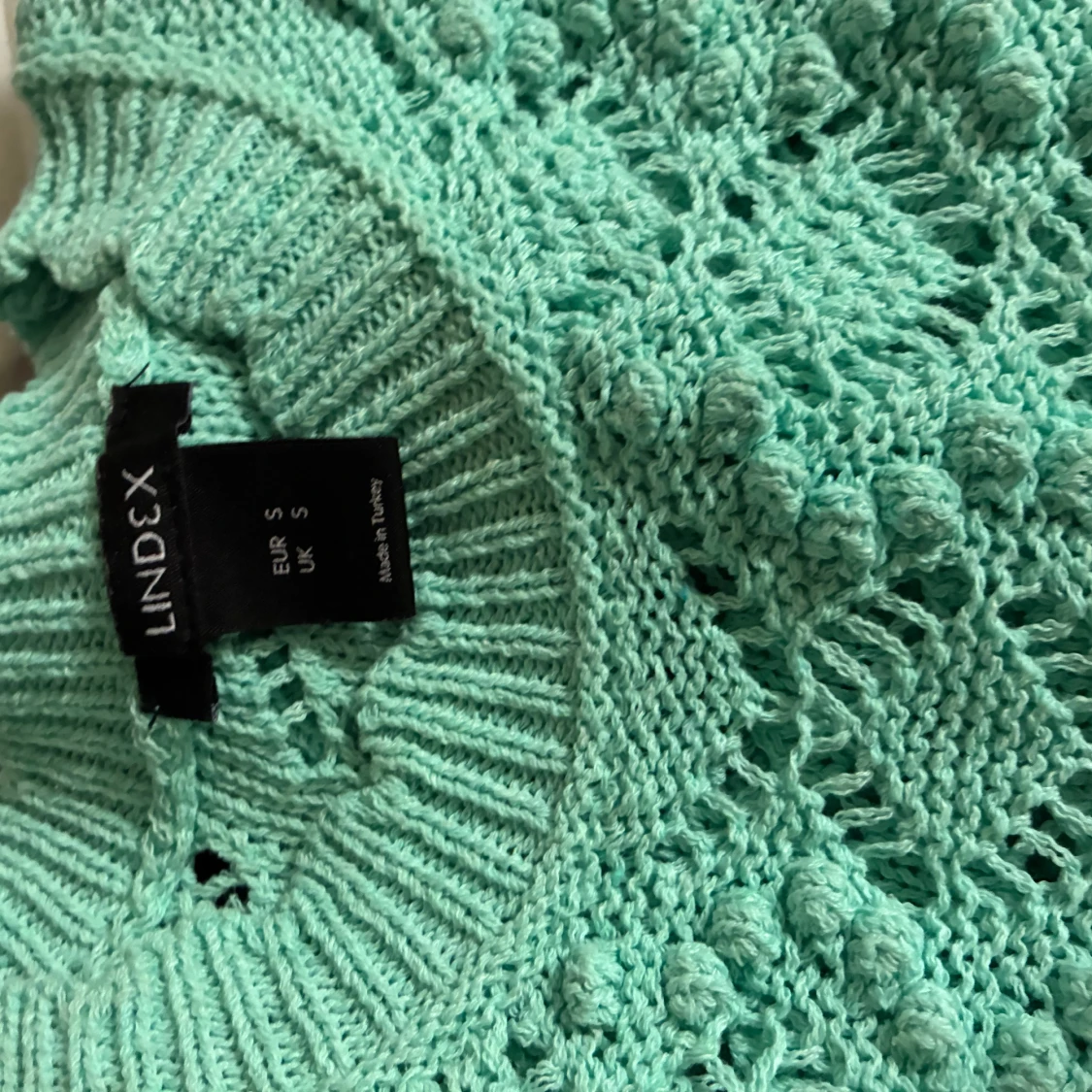 Superfin mintgrön stickad tröja från Lindex i storlek S. Tröjan har ett genombrutet, virkat mönster och puffiga ärmar med ribbade muddar. Perfekt för att liva upp garderoben med en fräsch färg och cool struktur.