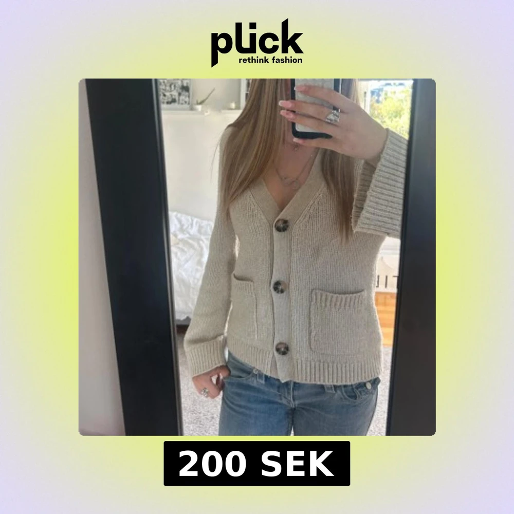 Supermysig beige stickad kofta med stora knappar framtill och två fickor. Koftan har v-ringning och långa ärmar, perfekt att slänga på sig över en t-shirt eller linne. Enkel och stilren design som passar till allt.