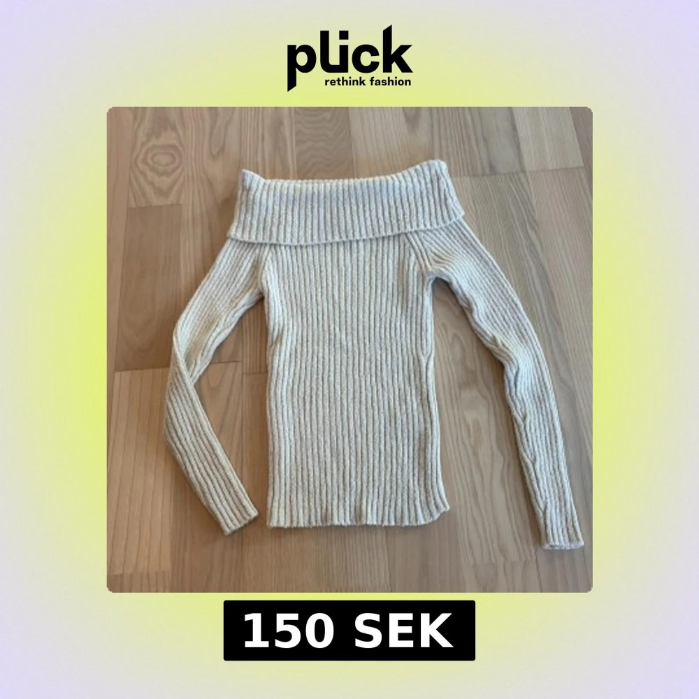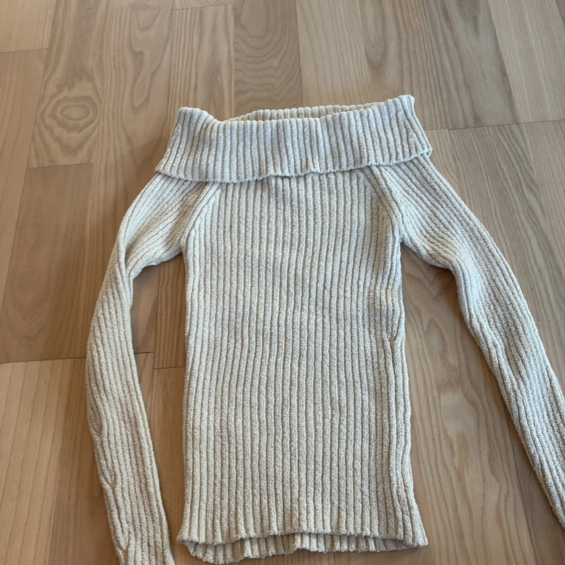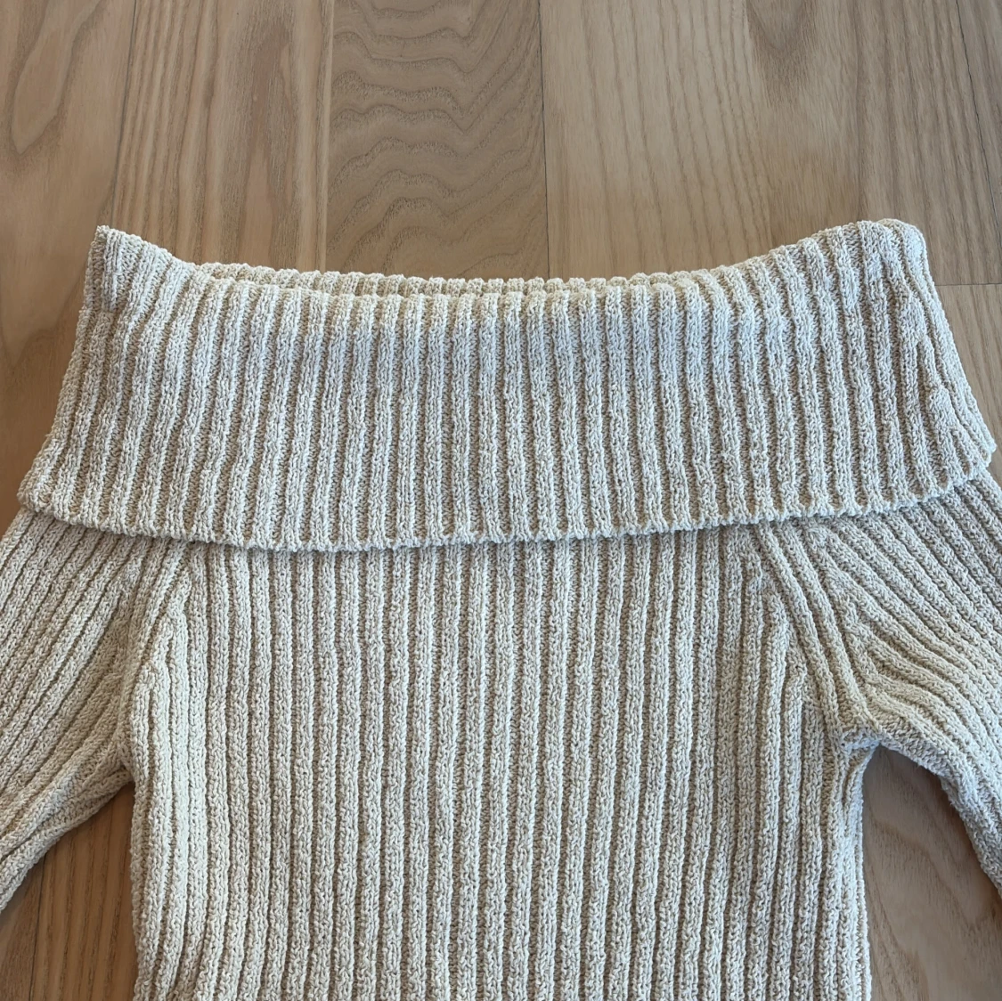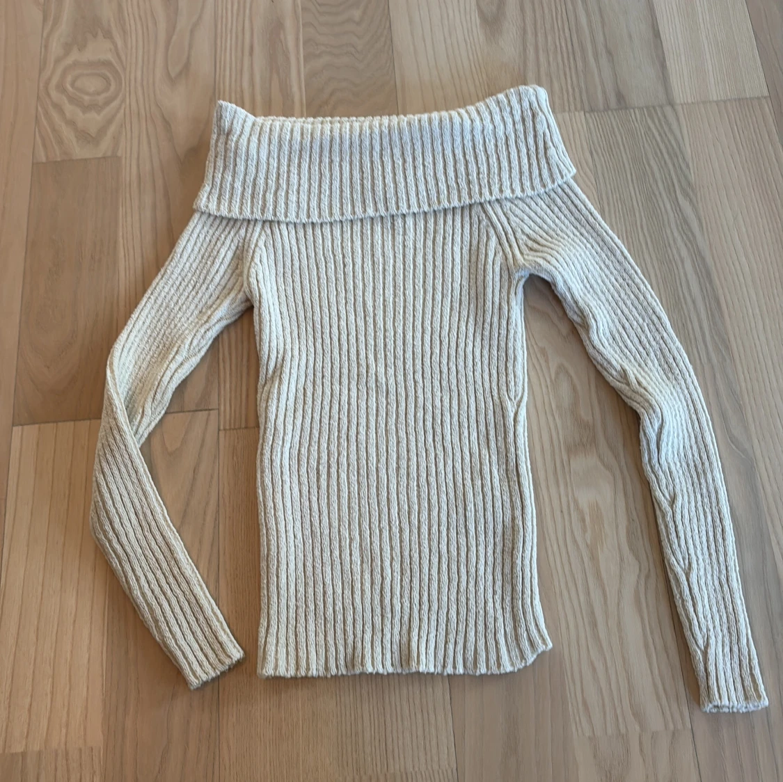 Säljer en ribbstickad offshoulder-tröja från Lindex i beige. Tröjan har lång ärm och bred, vikt krage som sitter snyggt över axlarna. Tröjan är aldrig använd