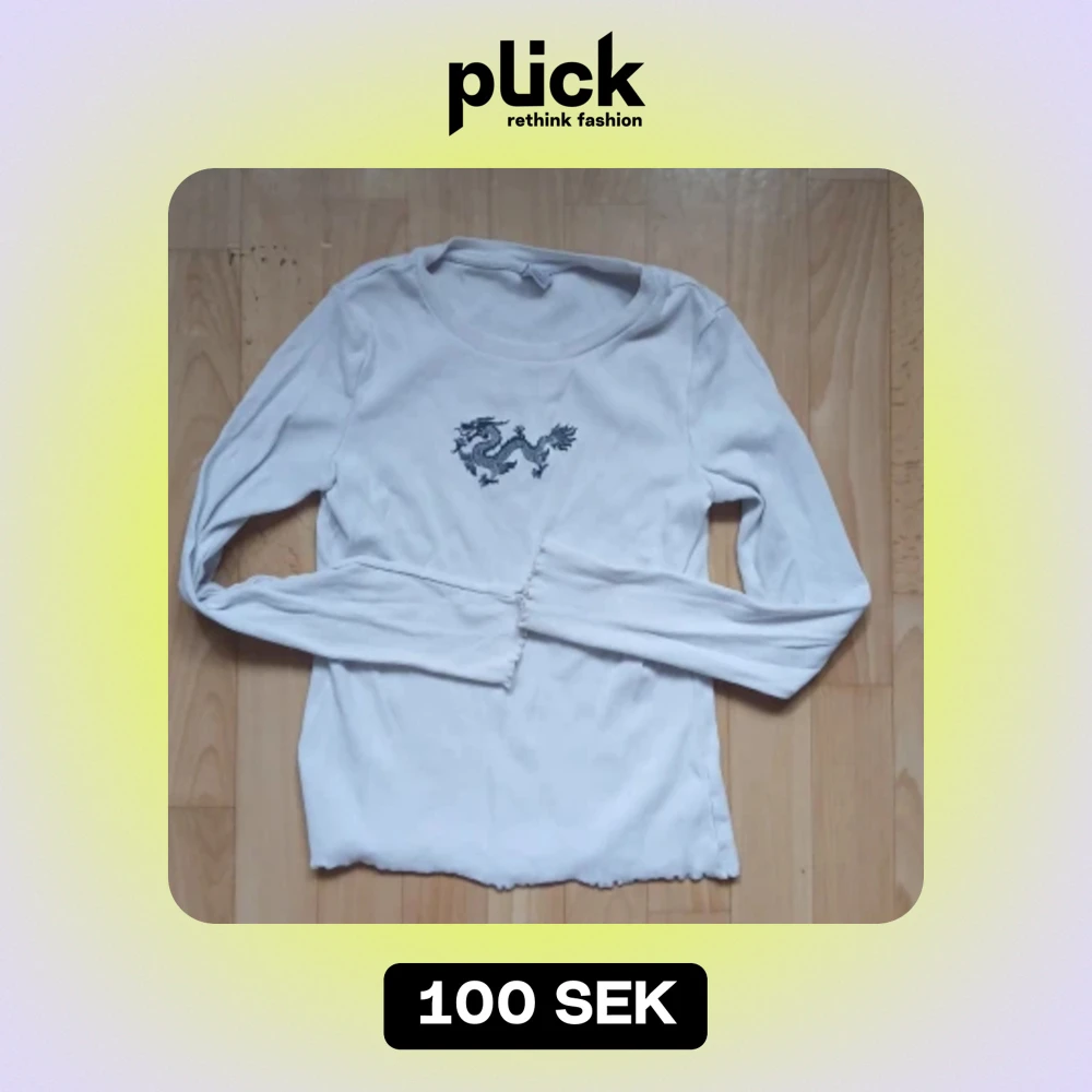 En vit långärmad tröja från Lindex med ett svart drakmönster på bröstet. Tröjan har ribbade muddar vid ärmslut och nederkant. Obs barnstorlek men sitter som en XS om man gillar baby tee looken.