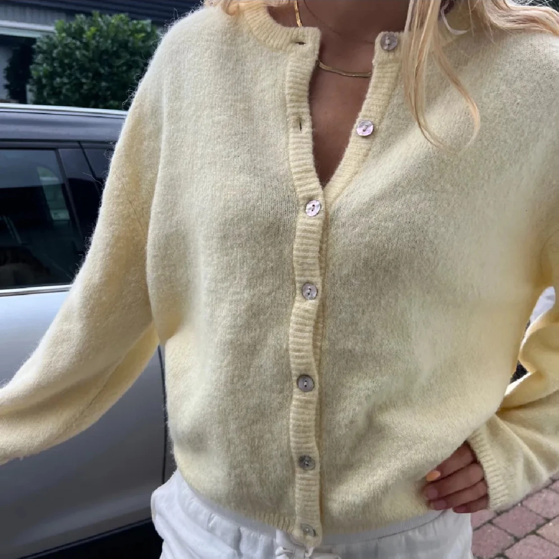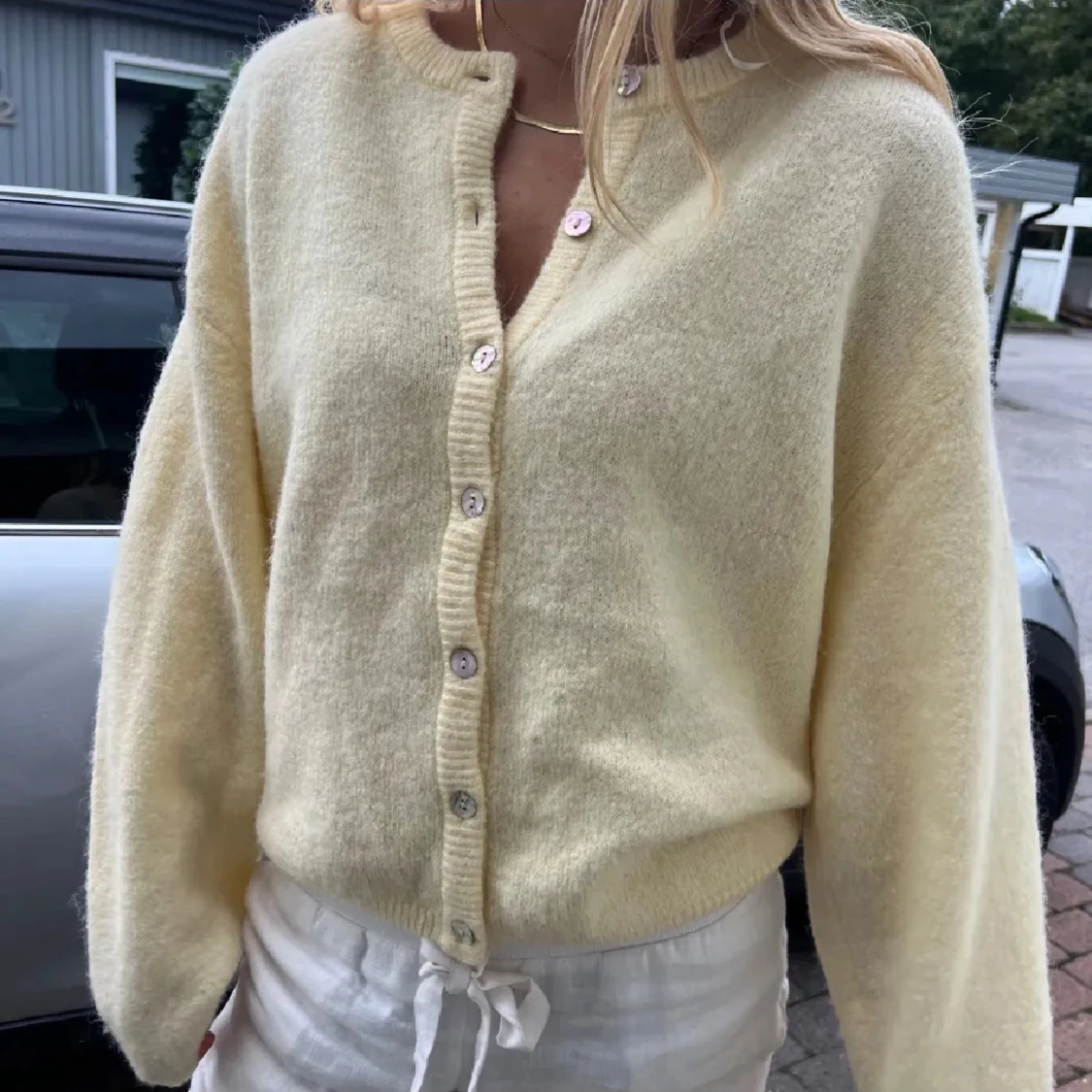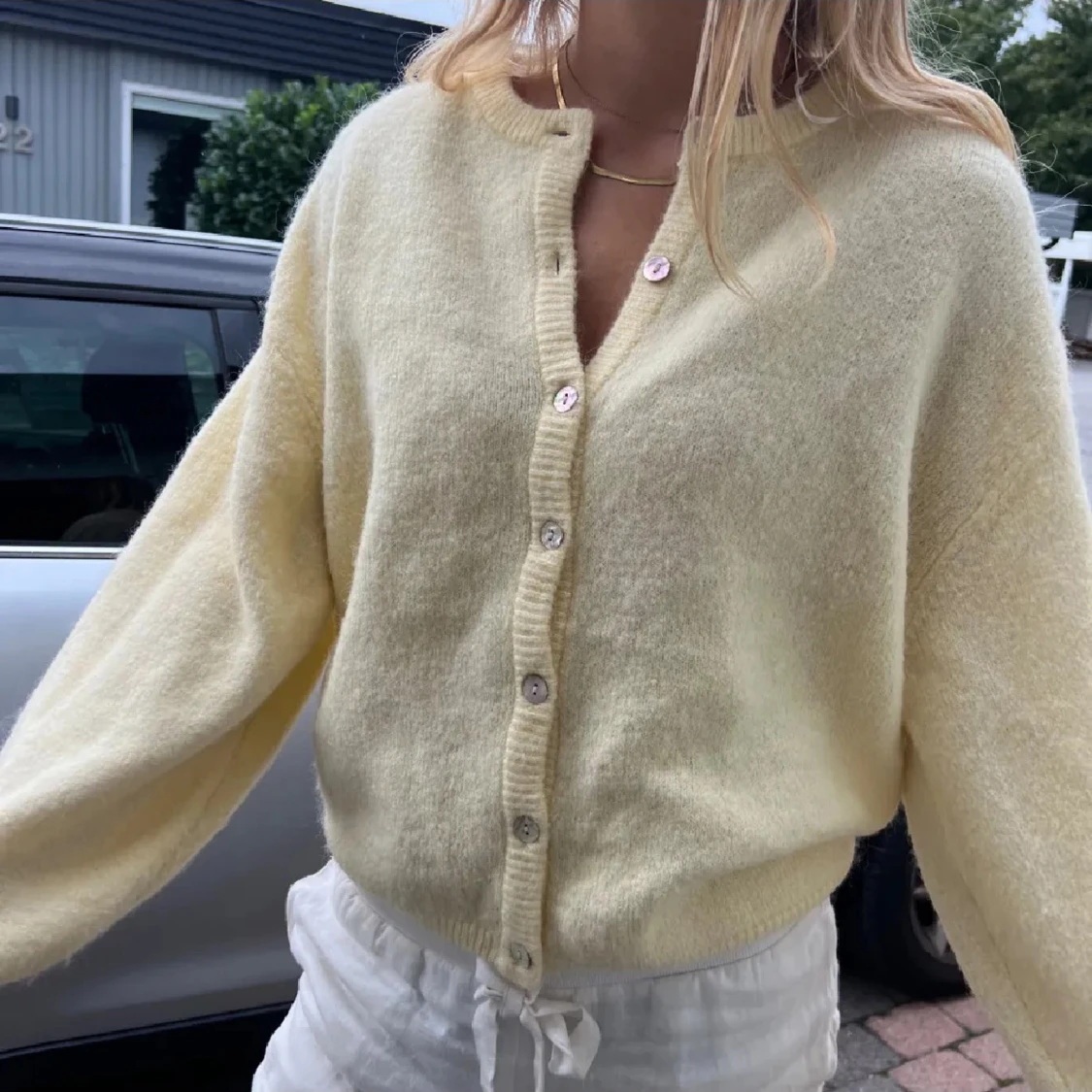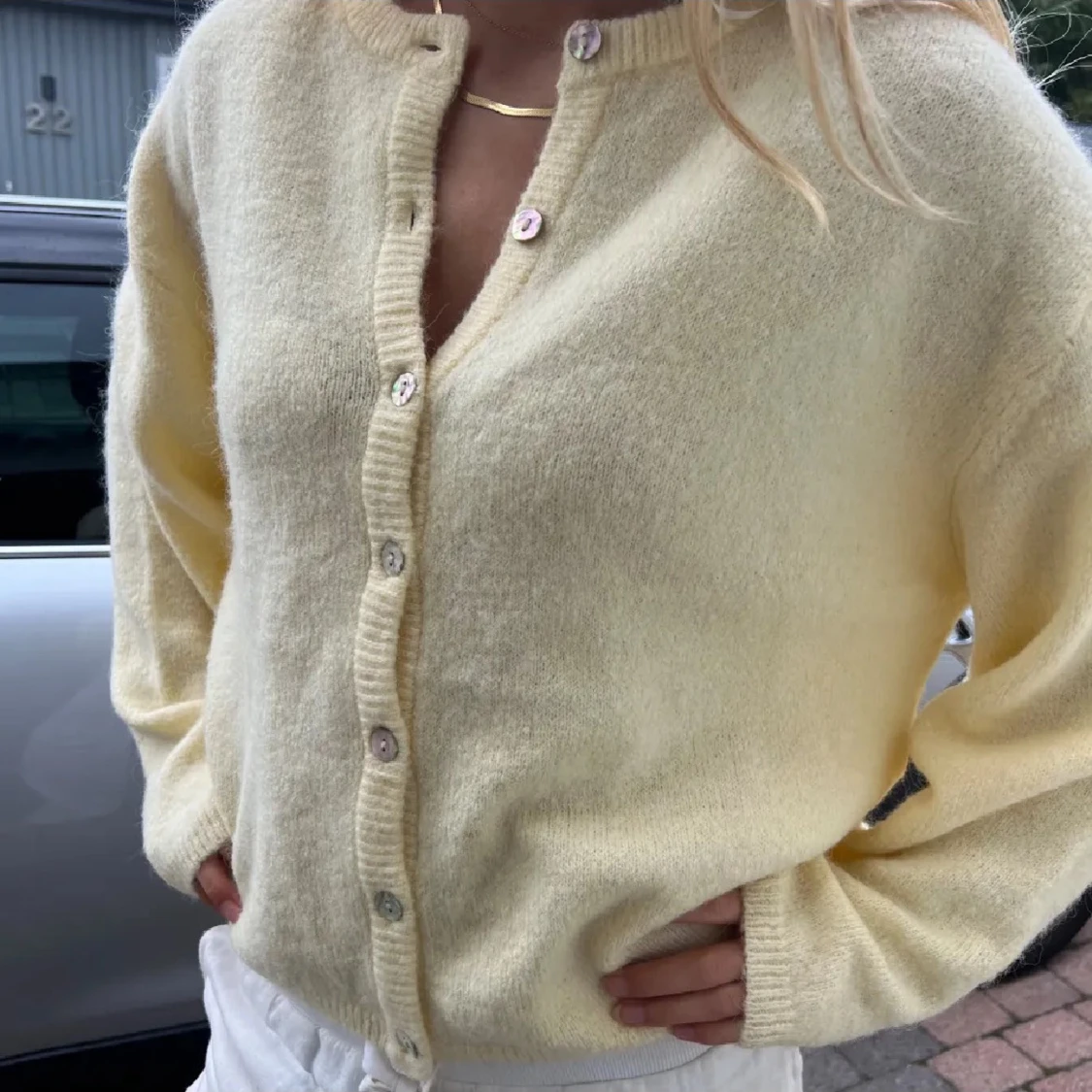 Mysig ljusgul kofta med rund hals och pärlemorknappar framtill. Tröjan har en loose passform och är stickad i ett mjukt material som känns fluffigt. Perfekt att slänga på sig när det är lite kyligt ute.