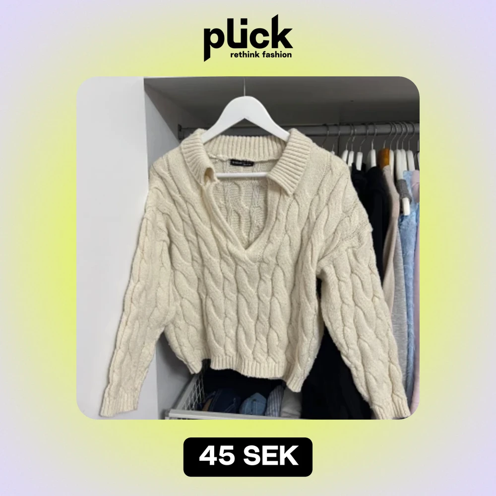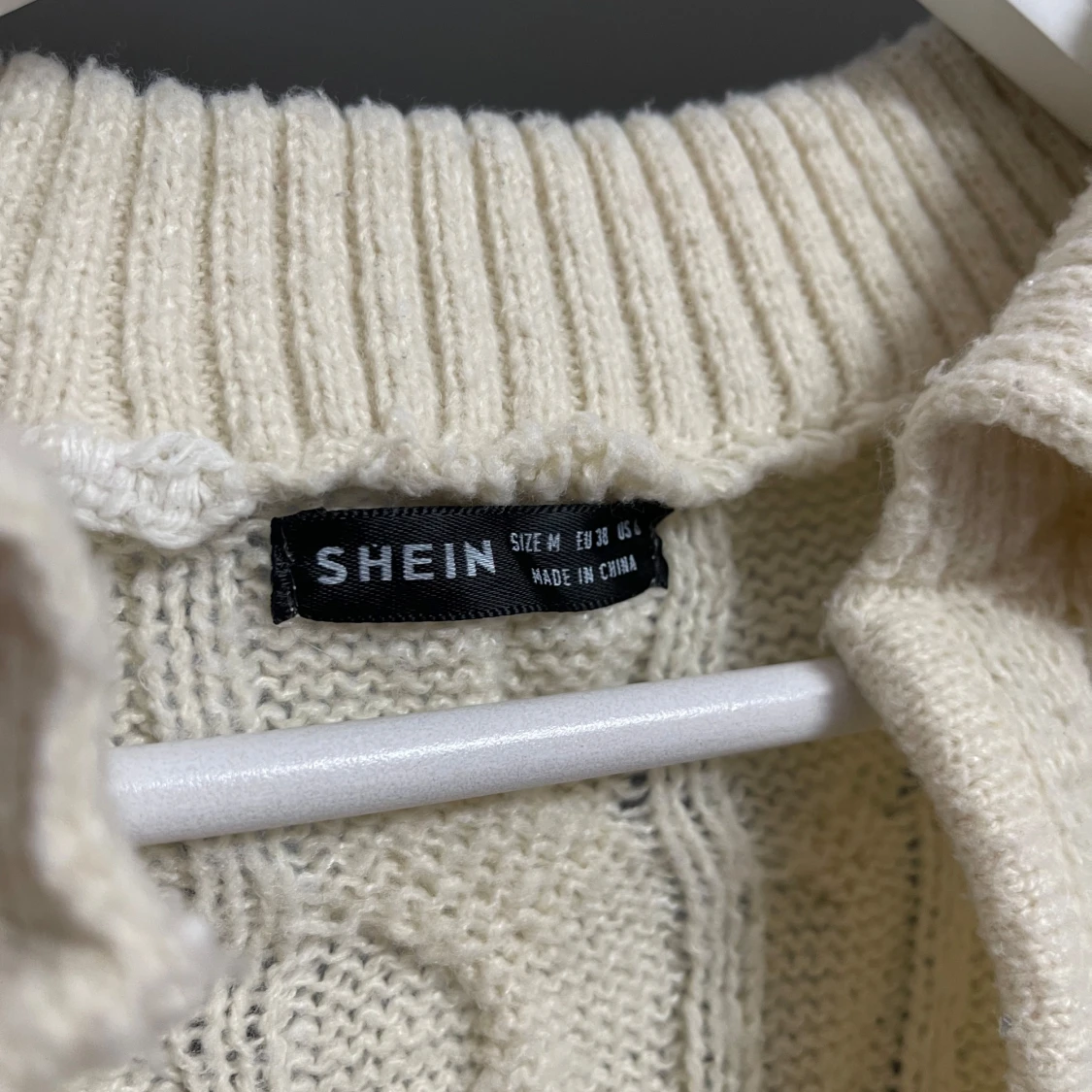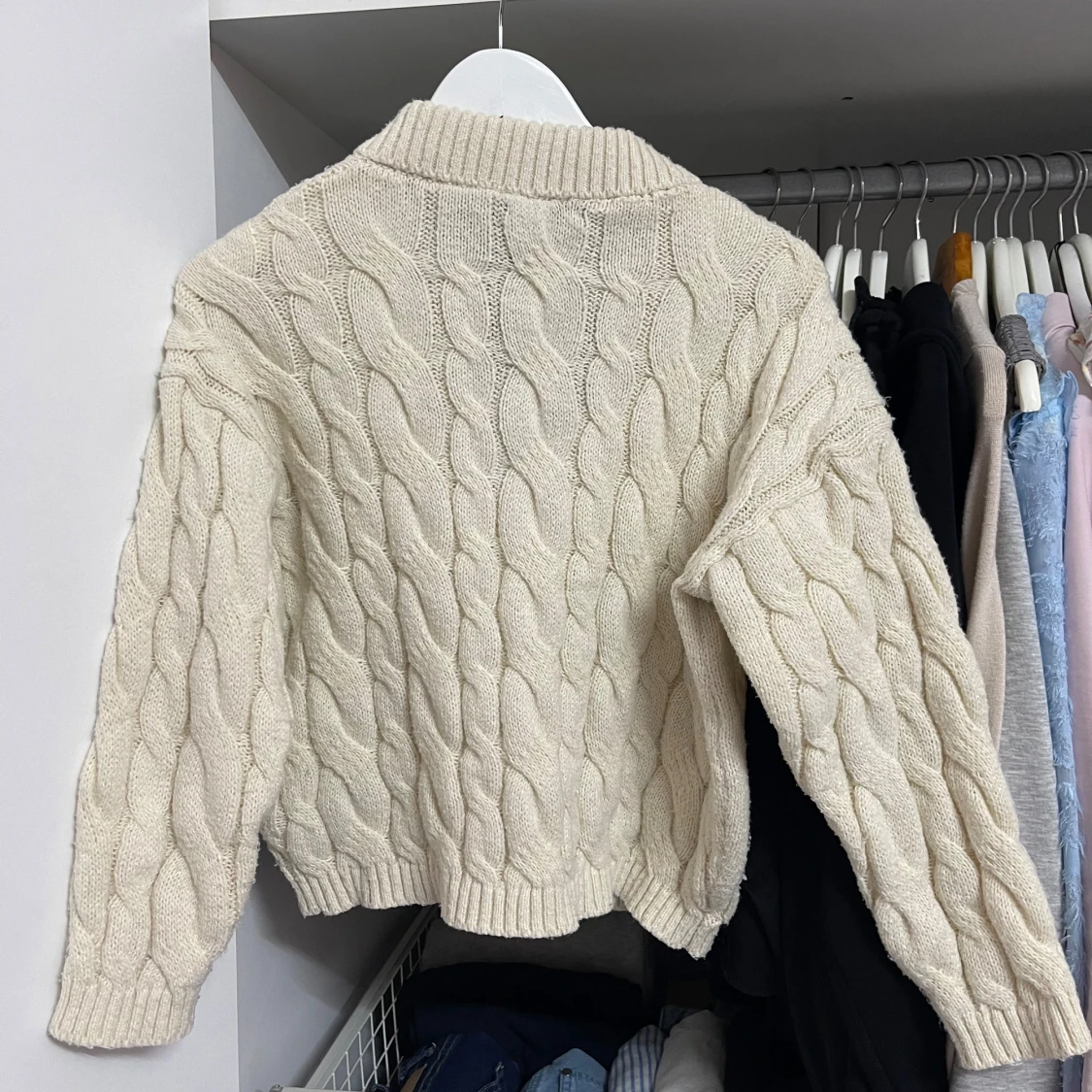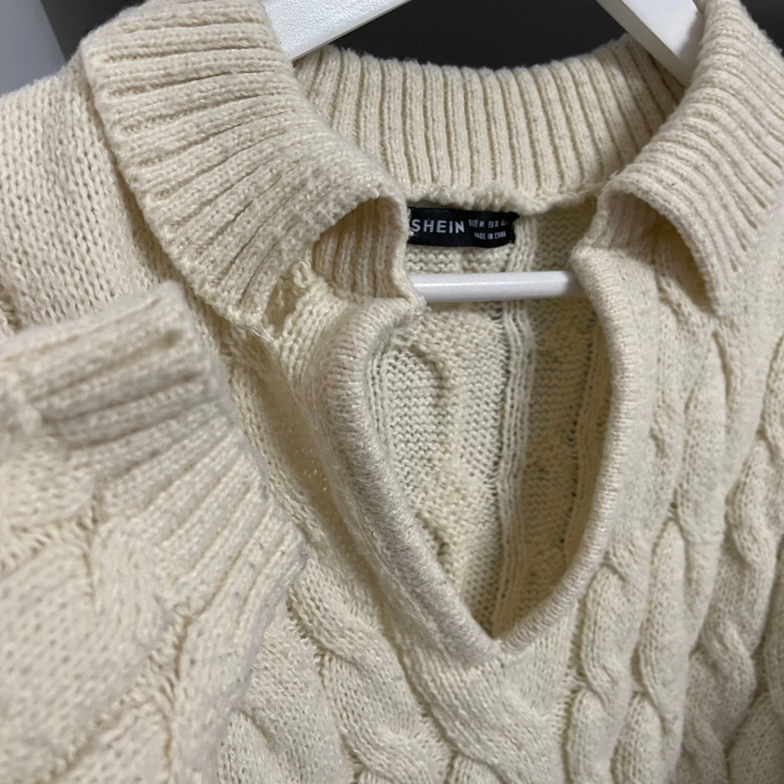 Säljer en superfin beige stickad tröja från Shein. Den har en snygg kabelstickad design och en v-ringad krage som ger en stilren look. Tröjan är croppad, har långa ärmar, perfekt för höst och vinter. Den är i bra skick och passar perfekt till både