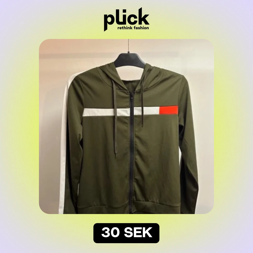 En grön huvtröja från Shein med dragkedja framtill. Tröjan har en vit och röd randdetalj på bröstet och vita ränder längs ärmarna. Den har en huva med dragsko och långa ärmar.
