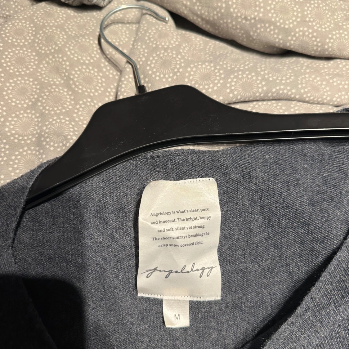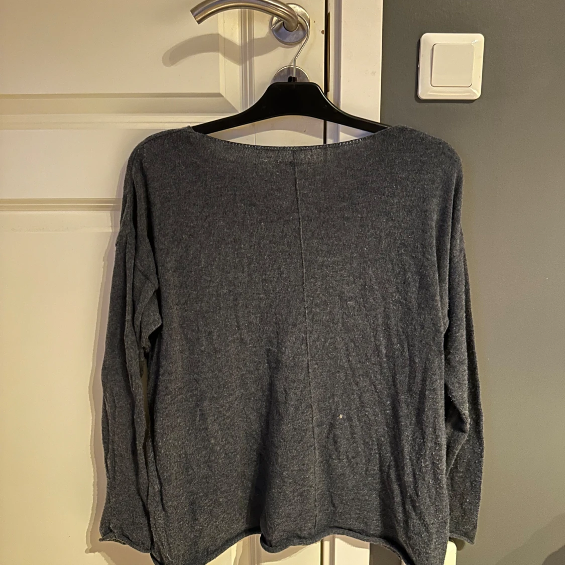 Mysig mörkgrå stickad tröja från Angelology i storlek M. Tröjan har en avslappnad passform, rund halsringning och långa ärmar. Sömmen framtill ger en enkel men snygg detalj. Perfekt för lager-på-lager under kyliga dagar.