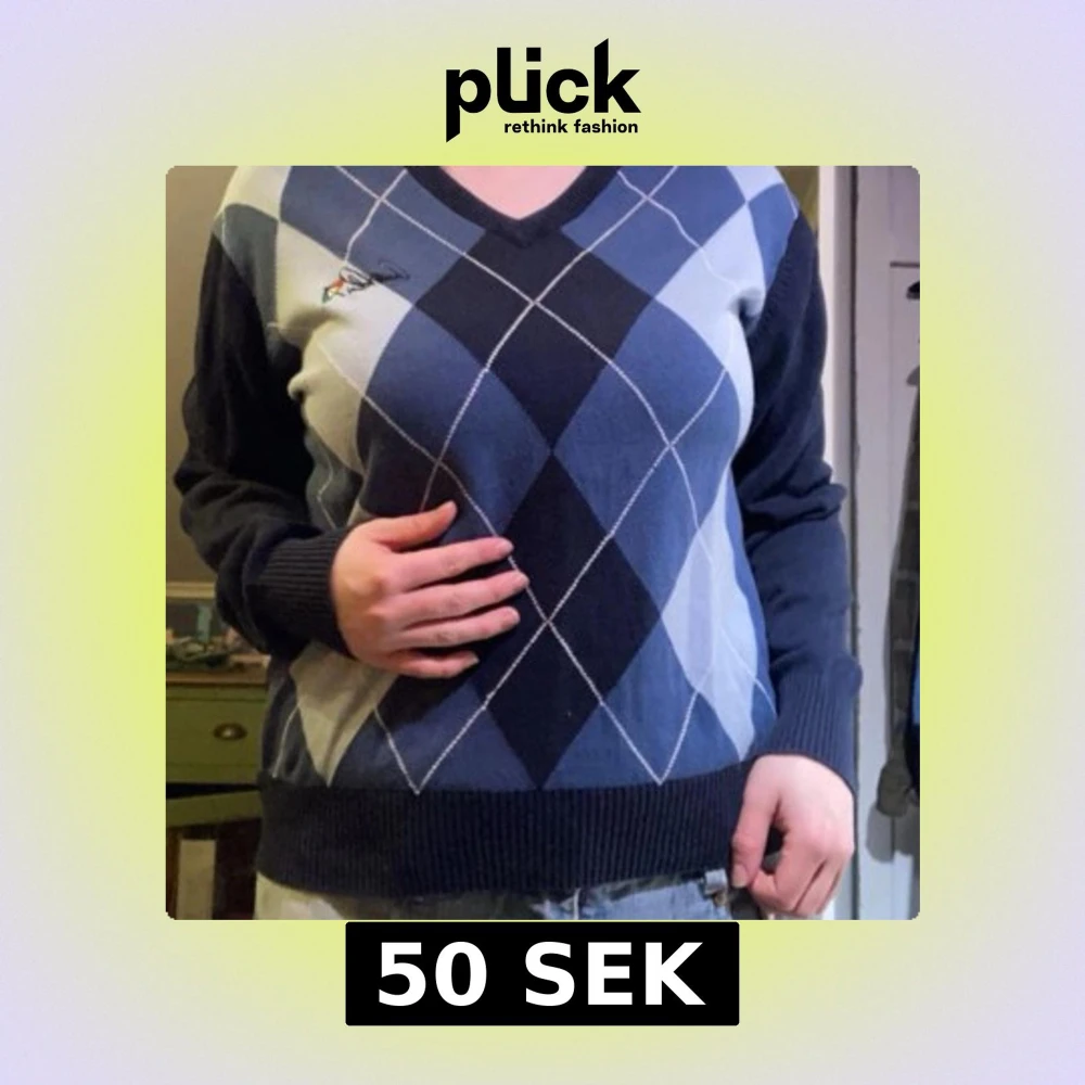 Säljer en blå tröja med v-ringning och rutigt mönster. Tröjan har långa ärmar och en broderad detalj på bröstet.