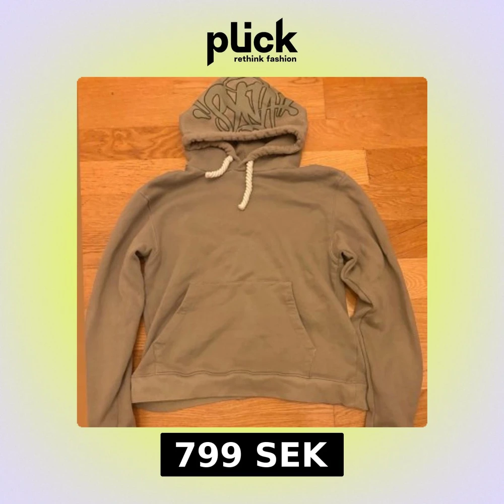 Säljer en hoodie med coolt tryck på huvan och grova vita snören. Tröjan har känguruficka framtill och är långärmad. Perfekt för dig som gillar en avslappnad och stilren look.
