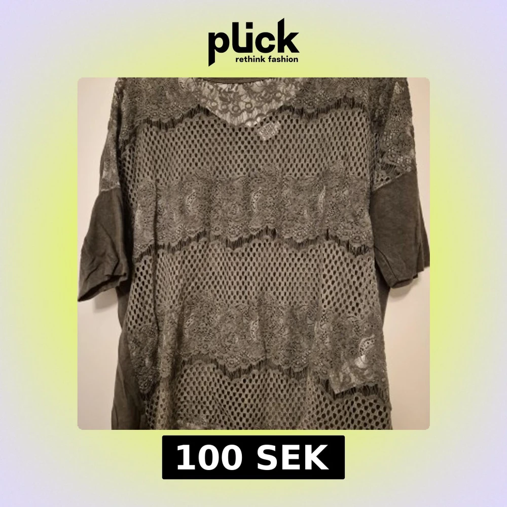 Snygg grå topp med spetsdetaljer och nätmönster. Den har trekvartsärmar och en lös passform, perfekt för en stilren look. Passar bra till både jeans och kjol.