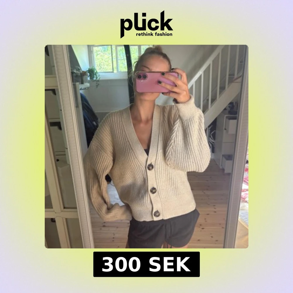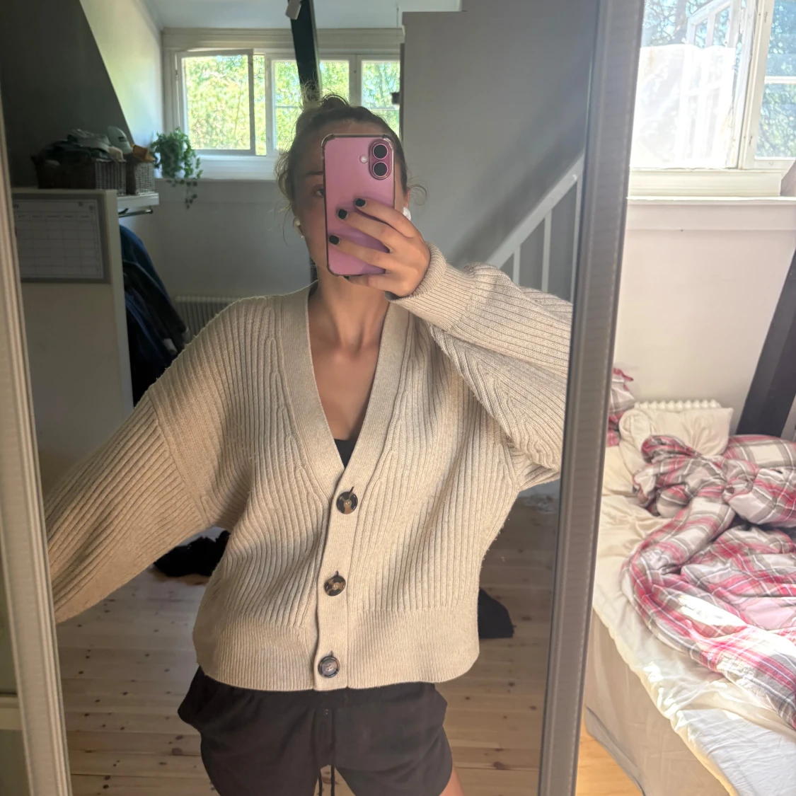 Supermysig beige kofta med bred ribbstickning och stora, mörka knappar framtill. Modellen är lite oversized med långa ärmar och djup v-ringning. Perfekt att slänga på sig över ett linne eller t-shirt för en chill look.