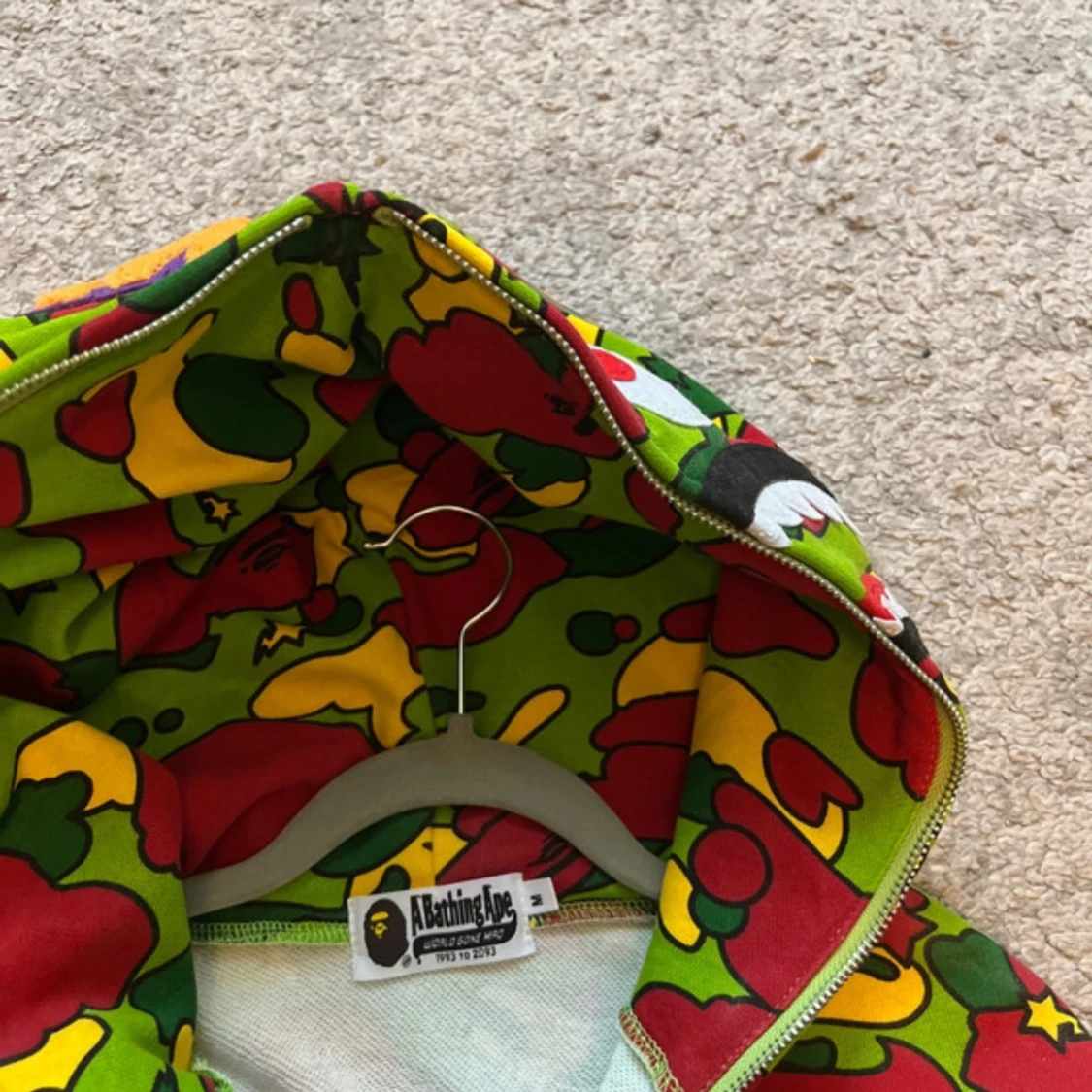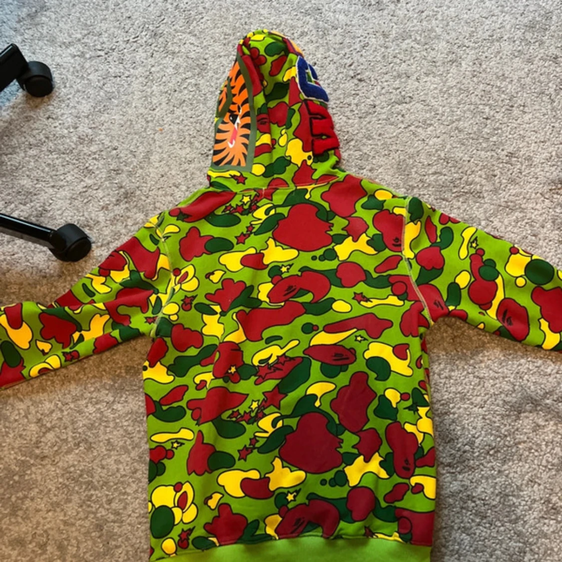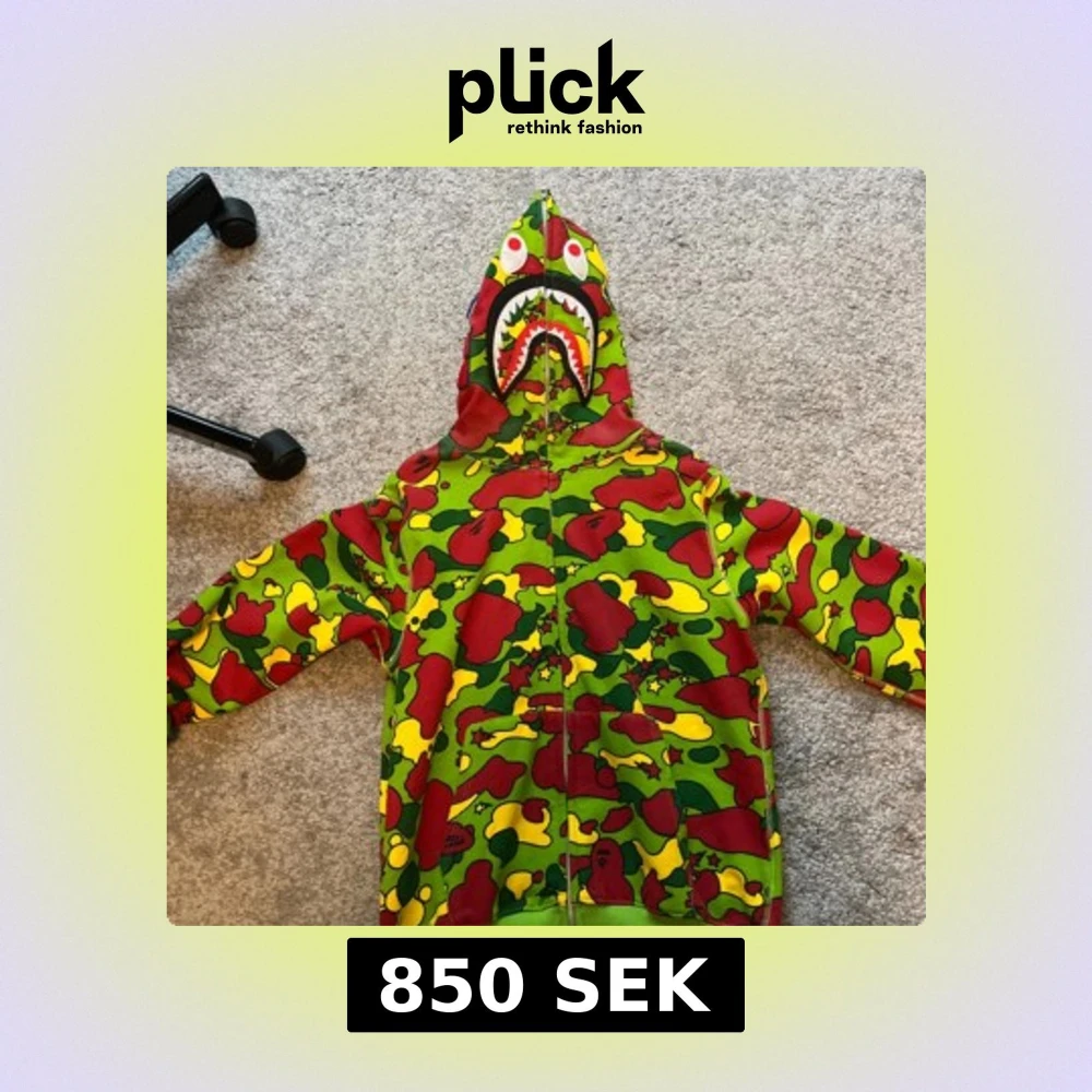 Fet hoodie från BAPE med ikoniskt shark-motiv på huvan och hel dragkedja. Färgglatt camo-mönster i grönt, rött och gult. Klassisk streetwear-vibe, perfekt för dig som vill sticka ut. Mjuk bomull och detaljerad design, med fickor framtill och ribbade muddar.