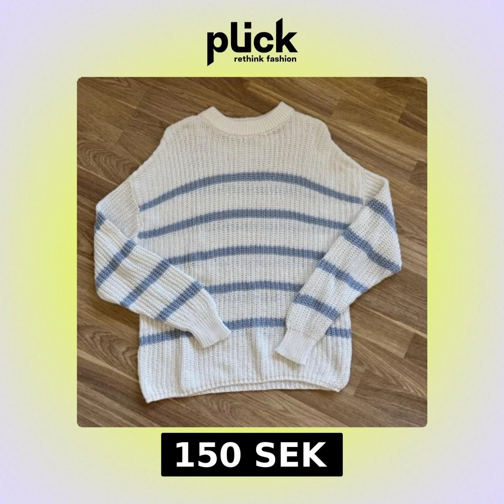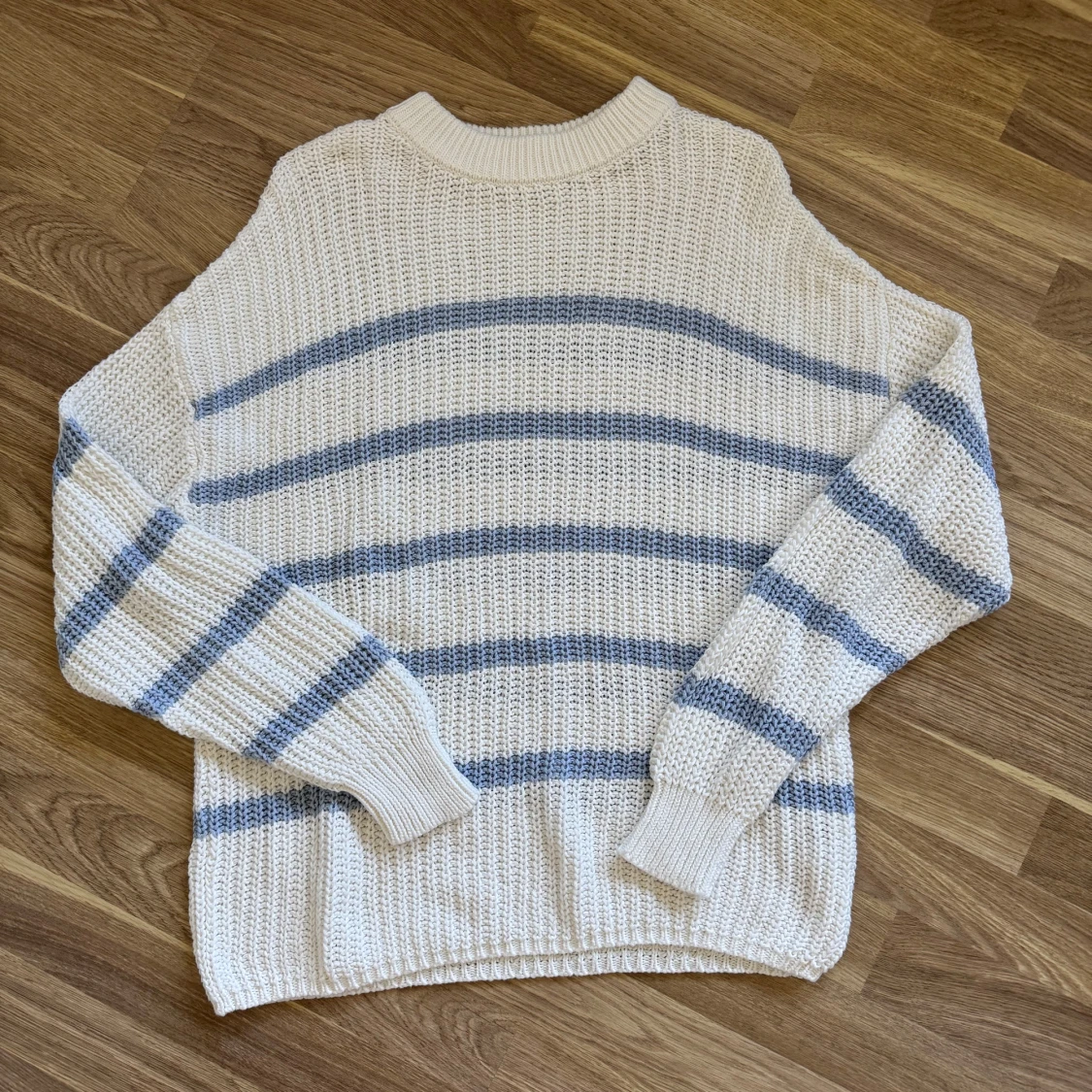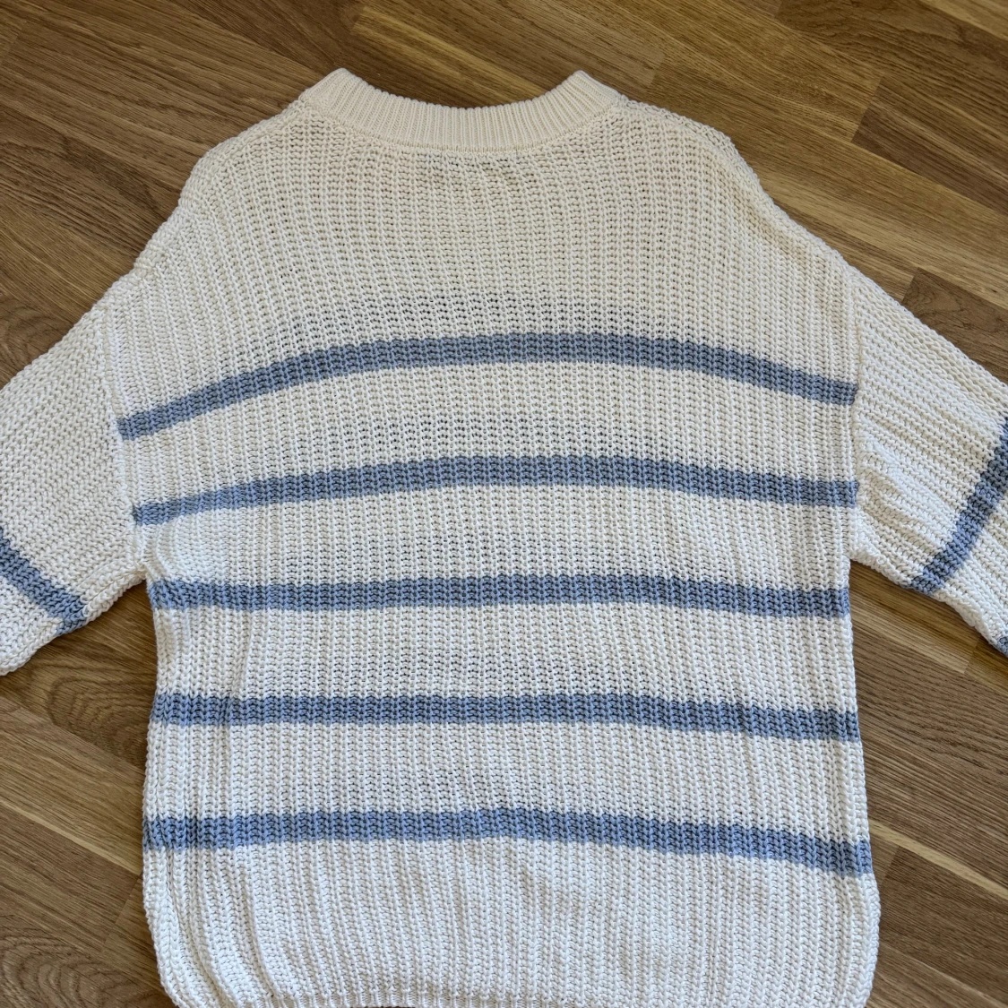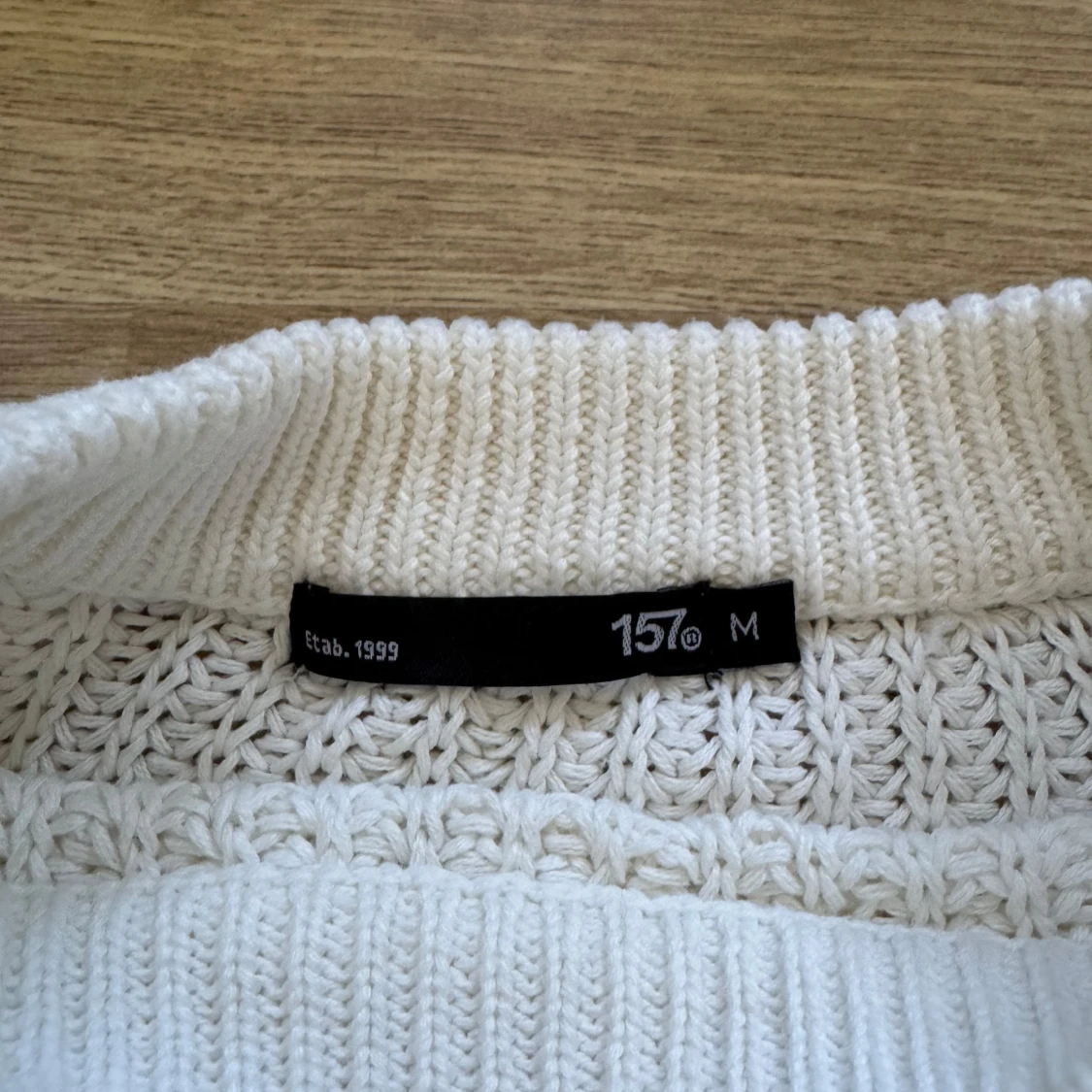 Vit stickad tröja från 157 i storlek M med ljusblå ränder. Tröjan har en grovstickad struktur, rund halsringning och långa ärmar.
