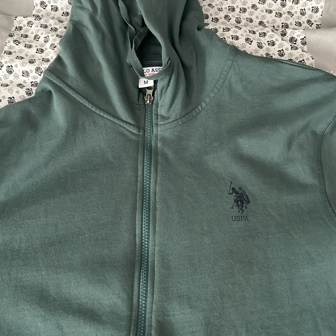 Säljer en grön hoodie från US Polo Assn med dragkedja och huva. Tröjan har en broderad logga på bröstet och är perfekt för en avslappnad stil. Passar bra till både jeans och joggers.