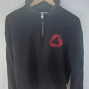 Säljer en svart tröja från Vailent med en halv dragkedja och röd grafik på bröstet. Perfekt för en avslappnad stil. Tröjan har långa ärmar och en bekväm passform.