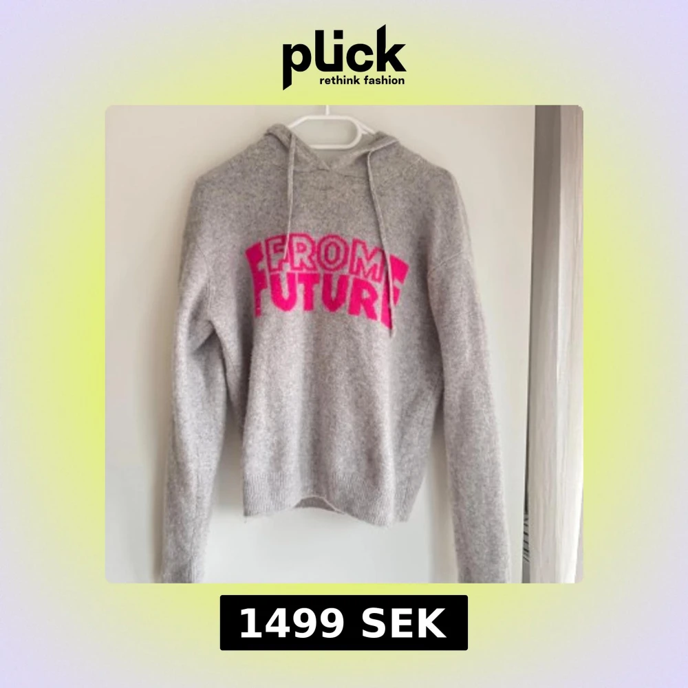 Säljer en supermjuk grå hoodie från From Future i 100% kashmir. Den har en cool rosa text på framsidan och en klassisk huva med dragsko. Perfekt för att hålla sig varm och stilren.