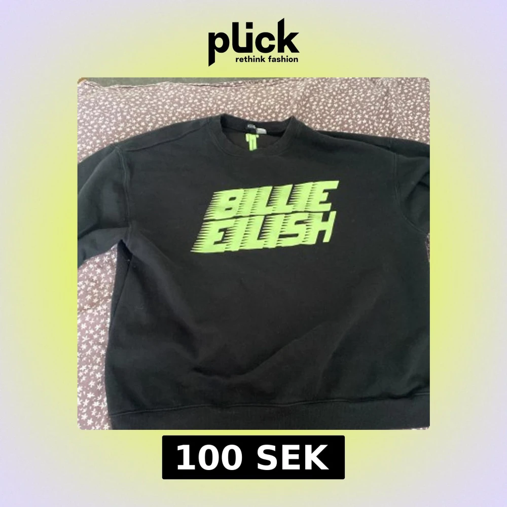 Säljer en svart tröja med ett coolt grönt Billie Eilish-tryck på framsidan. Perfekt för fans av artisten! Tröjan har en klassisk passform och är gjord i ett mjukt material.