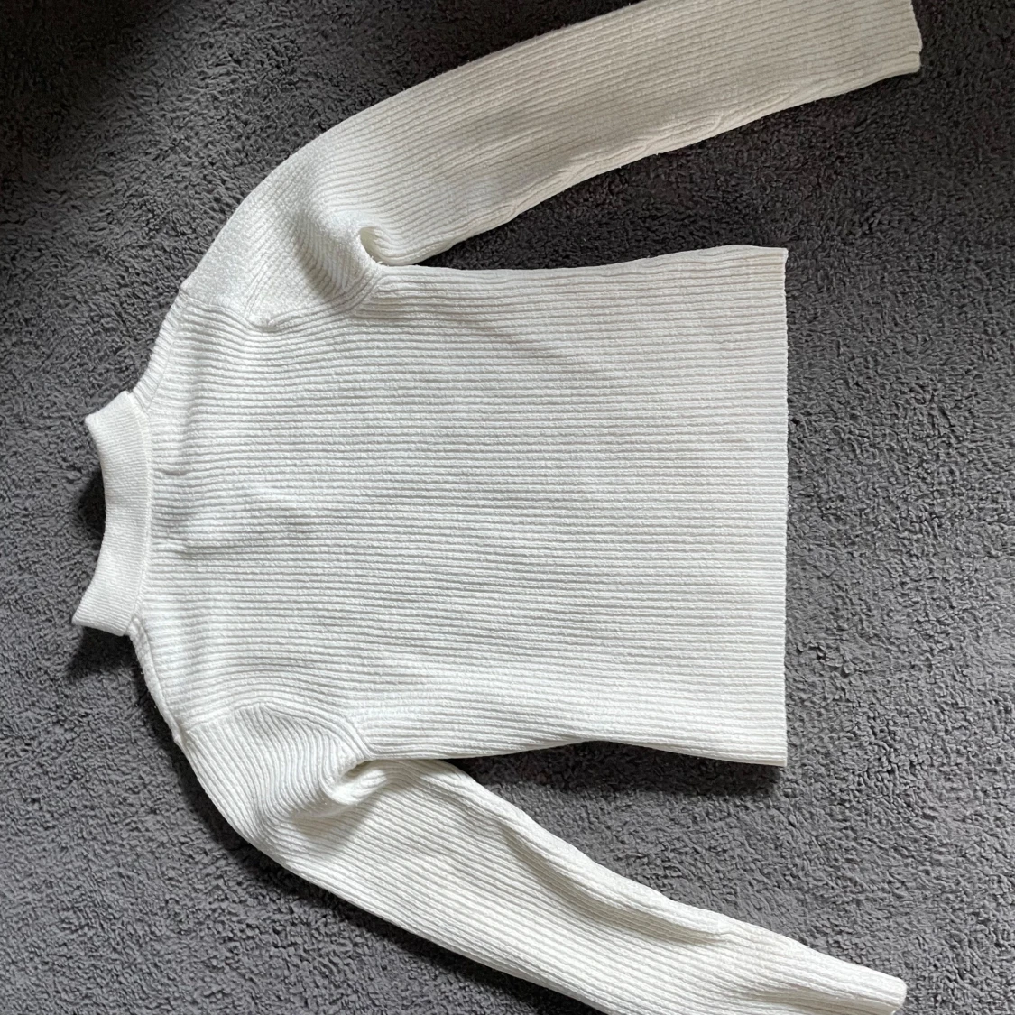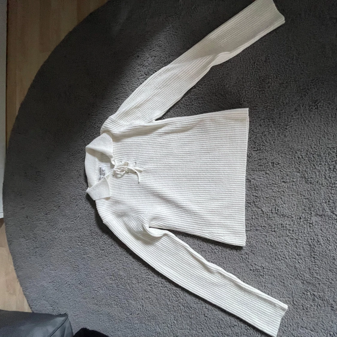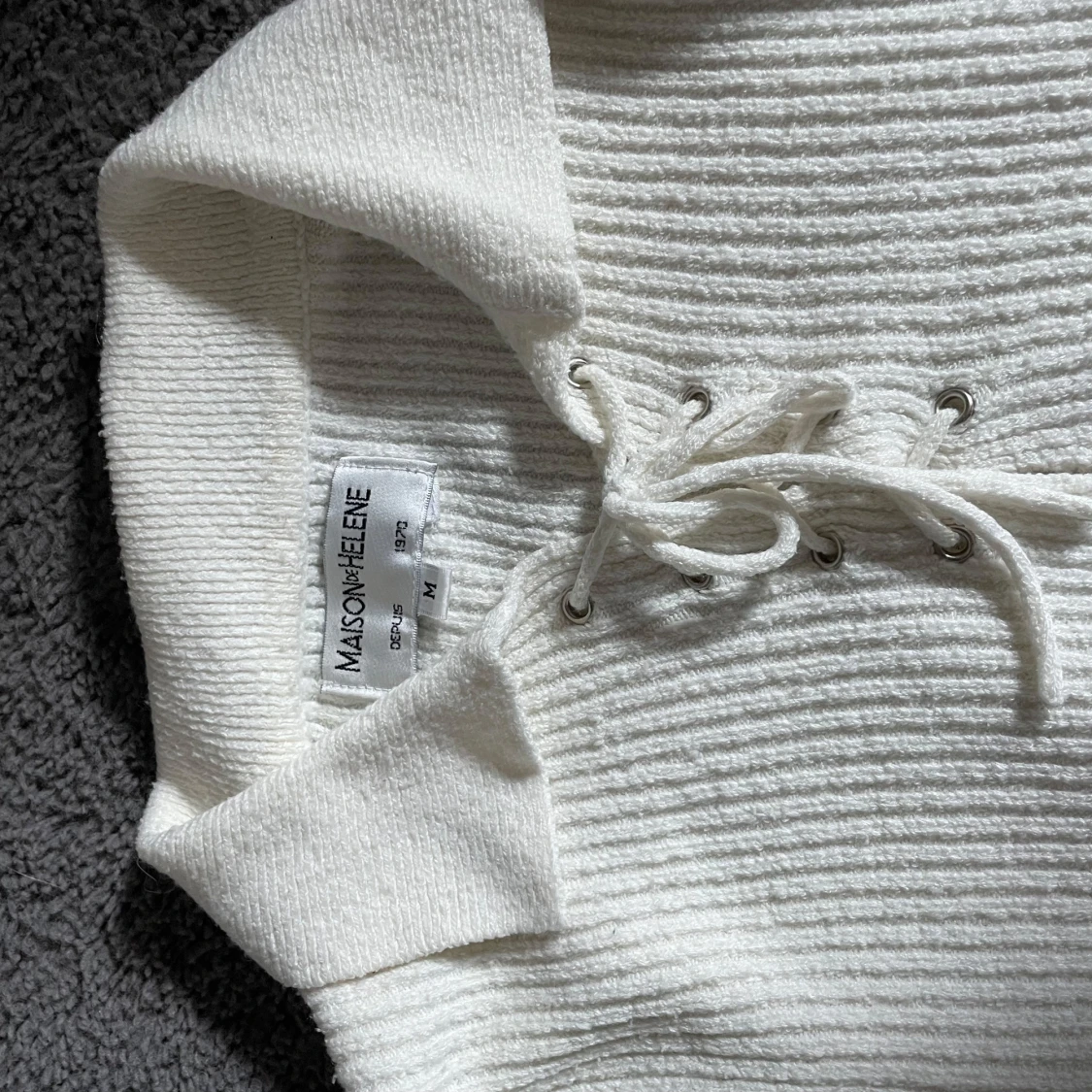 Säljer en stilren vit ribbad tröja från Maison Meilene. Tröjan har långa ärmar och en snygg snörning vid halsen som ger en unik touch. Knappt använd. Lite mindre i storleken så passar nog bättre för folk som har storlek S.