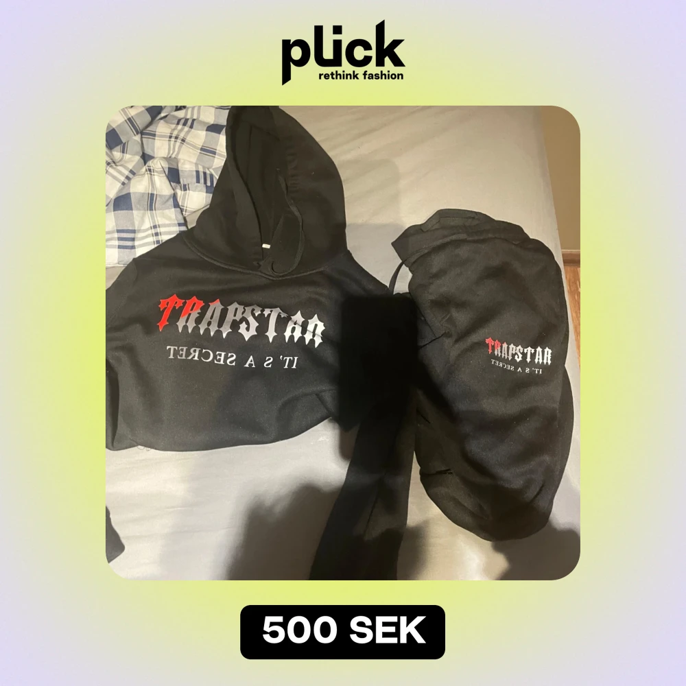 Säljer en svart hoodie från Trapstar med texten 'IT'S A SECRET' i vitt och rött på framsidan. Perfekt för en casual look eller streetwear-stil. Den är i bra skick och superbekväm. Passar perfekt till jeans eller joggers!