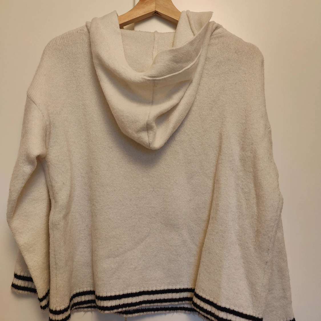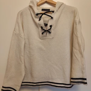 Säljer en vit hoodie från M&S med svart snörning framtill. Tröjan har långa ärmar och en luva, samt svarta ränder vid ärmslut och nederkant. Perfekt för en avslappnad stil.