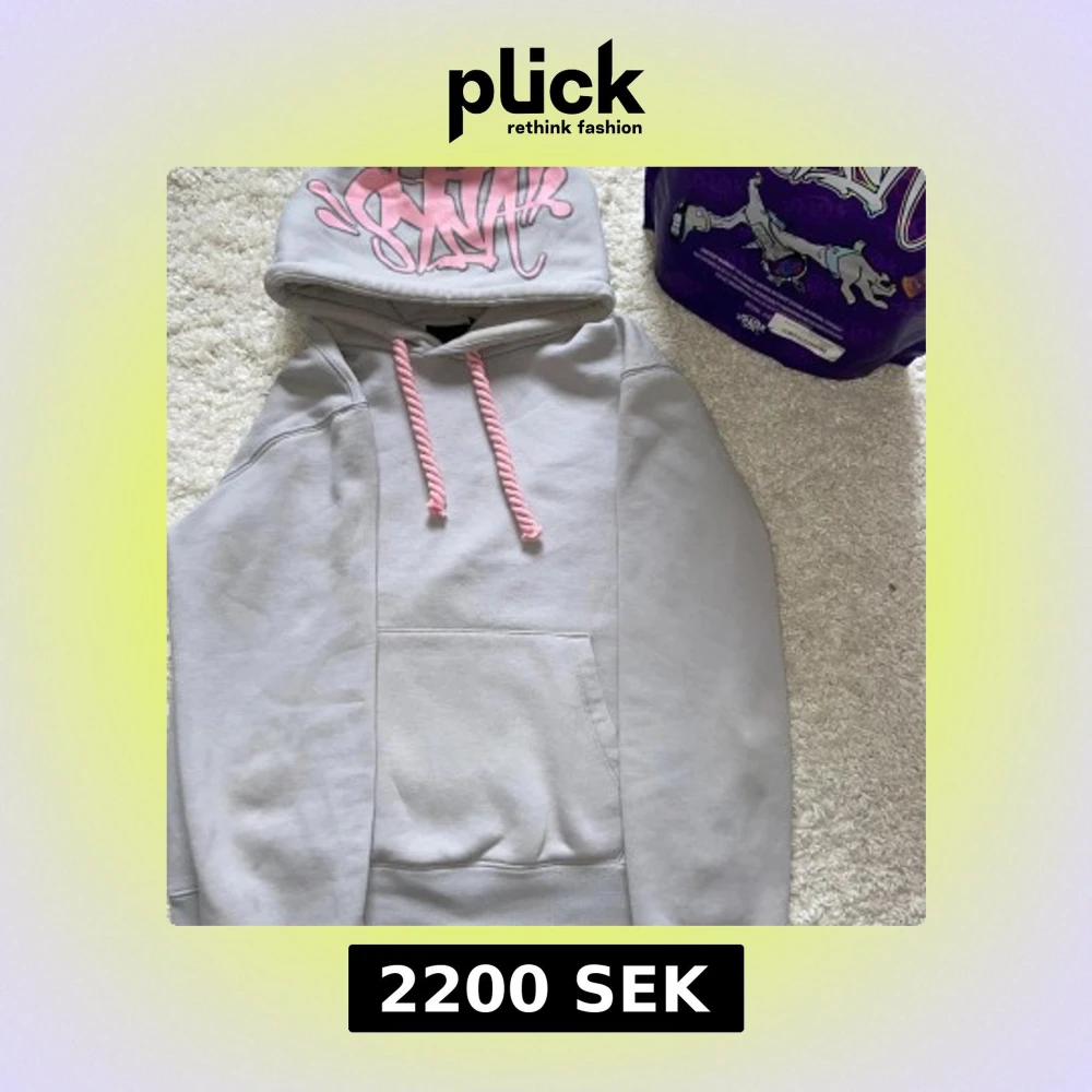 Säljer en grå hoodie från Syna World med rosa snören och tryck på huvan. Tröjan har en stor ficka framtill och är perfekt för en avslappnad stil. Den är tillverkad i ett mjukt material som känns skönt mot huden.