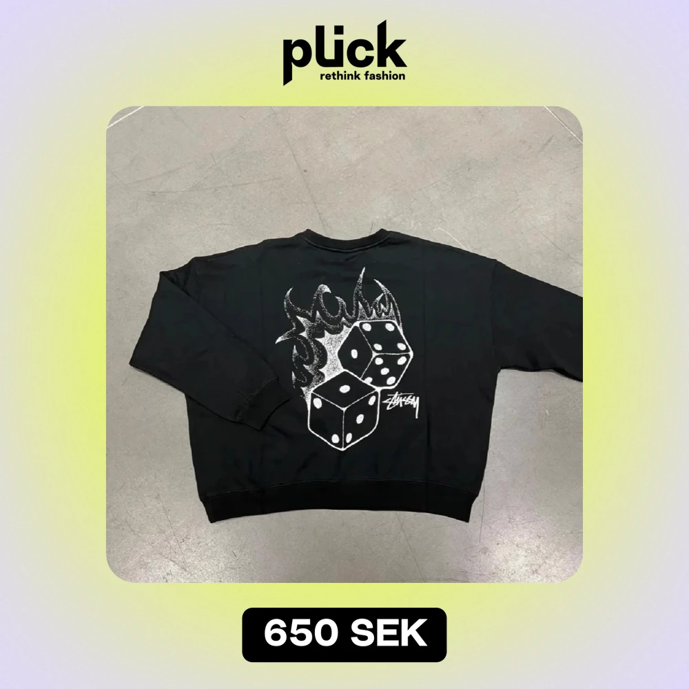 Säljer en svart sweatshirt från Stussy med ett coolt tryck av tärningar och eldflammor på ryggen. Perfekt för en avslappnad stil. Tröjan har långa ärmar och är i mycket bra skick.