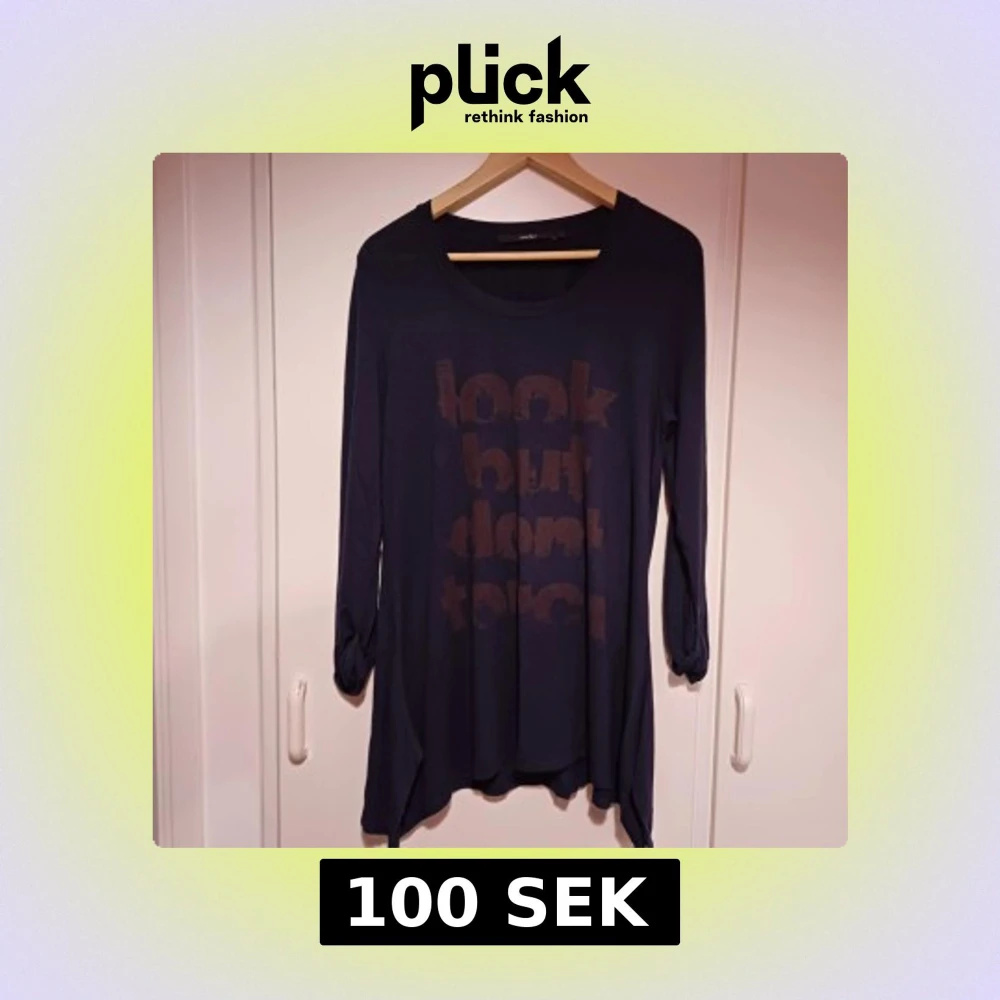 Snygg mörkblå långärmad tröja från One Two med trycket 'look but don't touch' framtill. Tröjan har rund halsringning, lite längre modell med asymmetrisk nederkant och knytdetalj vid ärmsluten. Perfekt för en chill och avslappnad stil.