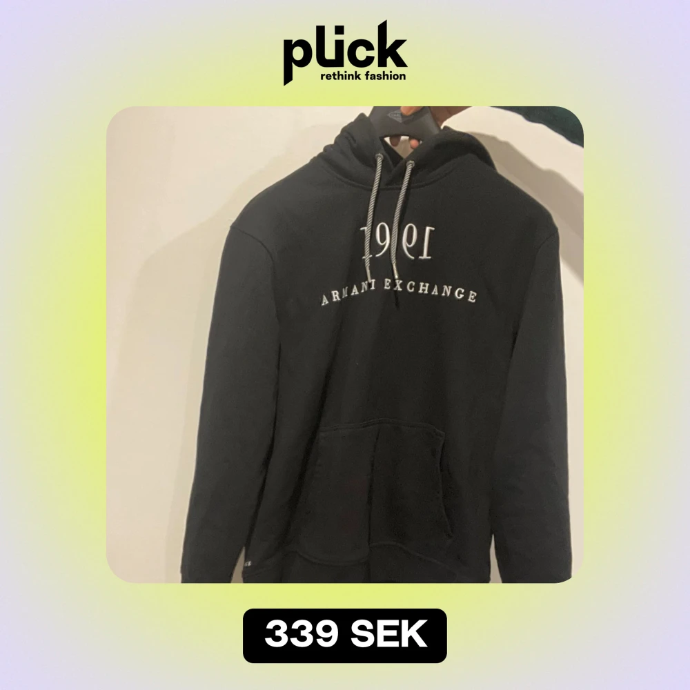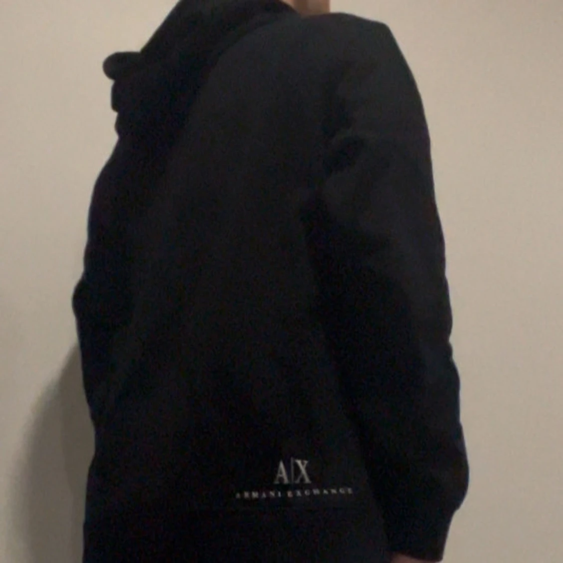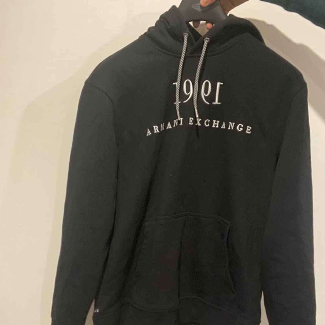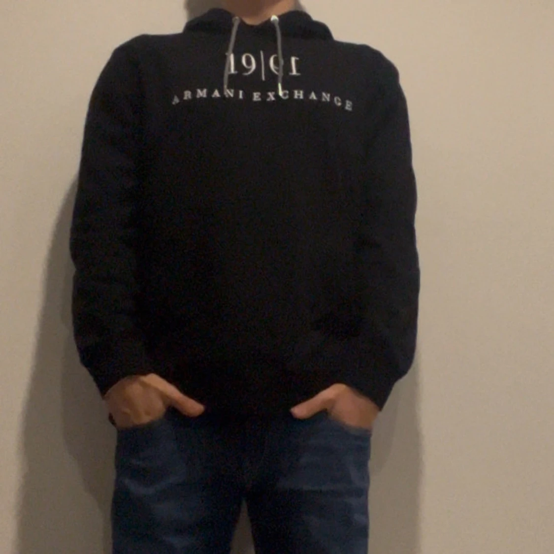 Säljer en snygg svart hoodie från Armani Exchange med vit text på bröstet. Den har en klassisk känguruficka och justerbar huva med snören. Perfekt för en casual look. Passar till alla tillfällen!
