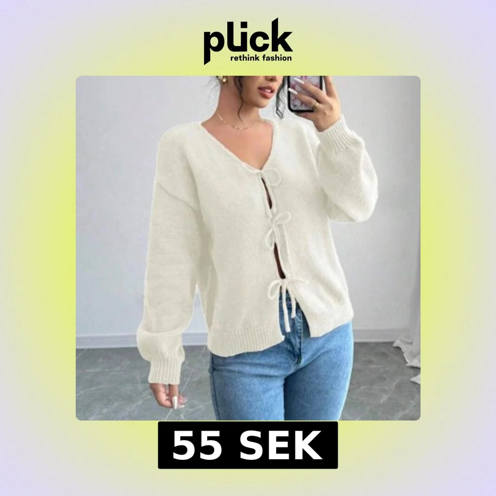 Superfin vit kofta från SHEIN i mjuk polyester. Koftan har v-ringning, långa ärmar och tre söta knyt framtill som ger en trendig look.