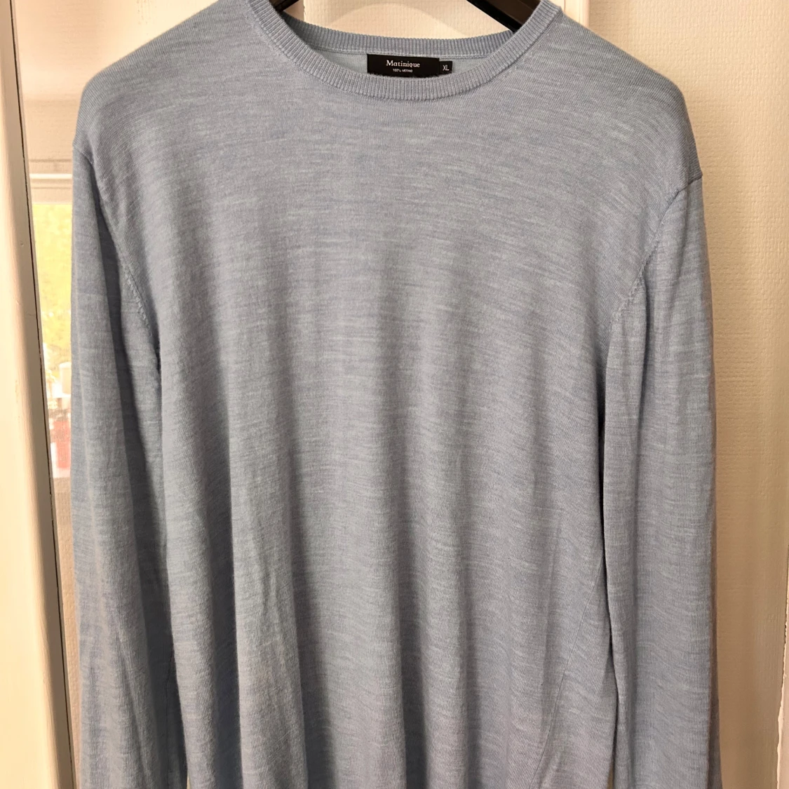 Tunn tröja gjort av marino ull. För varma dagar, den är tunn och baby blå. Det står att de är storlek XL men den passar mig som vanligtvis bör Medium