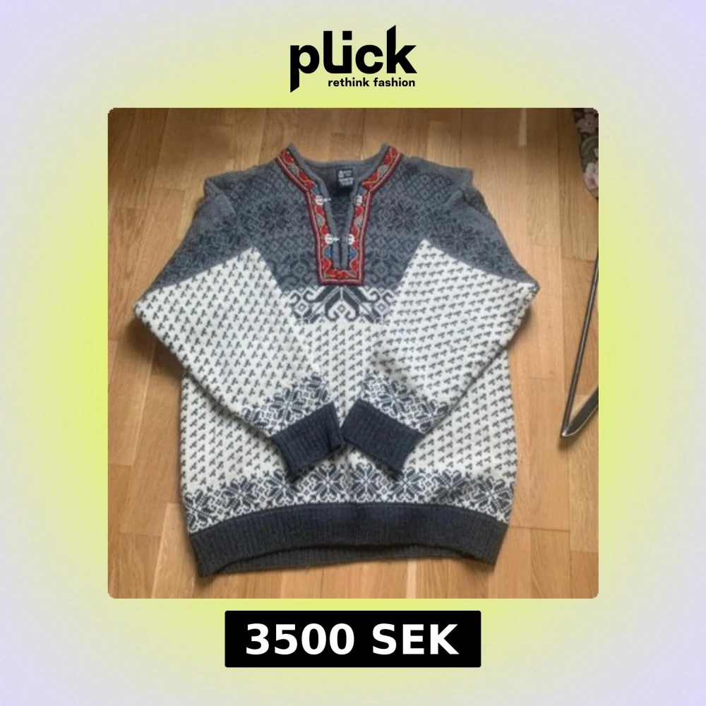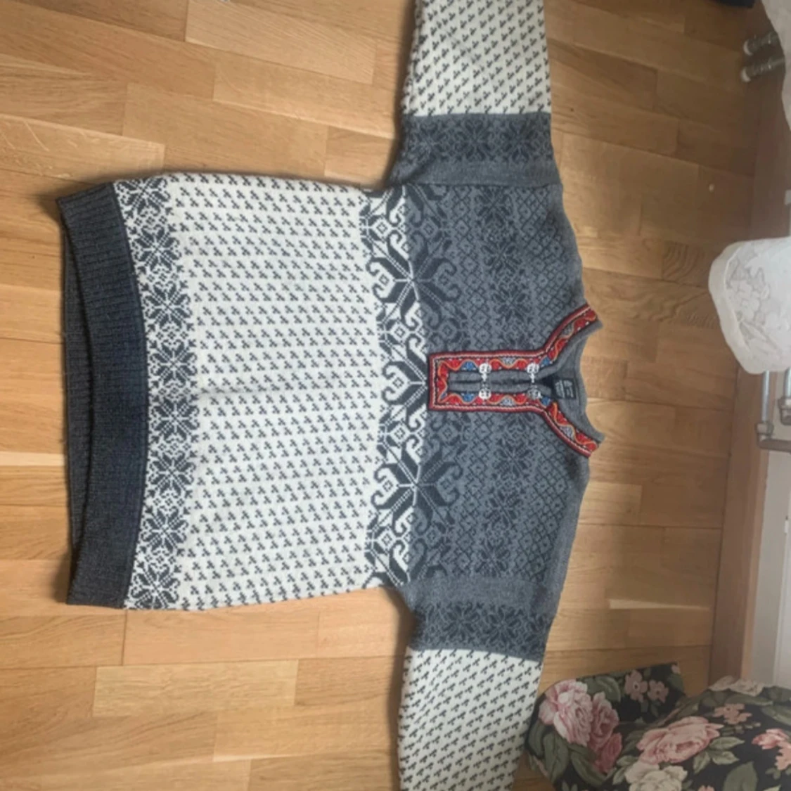 Traditionell norsk stickad tröja från Skjeveland i grått och vitt med snyggt mönster och broderad kant i rött, blått och gult. Tröjan har metallspännen vid halsen och är långärmad. Perfekt för kalla dagar och har en riktigt mysig vibe.